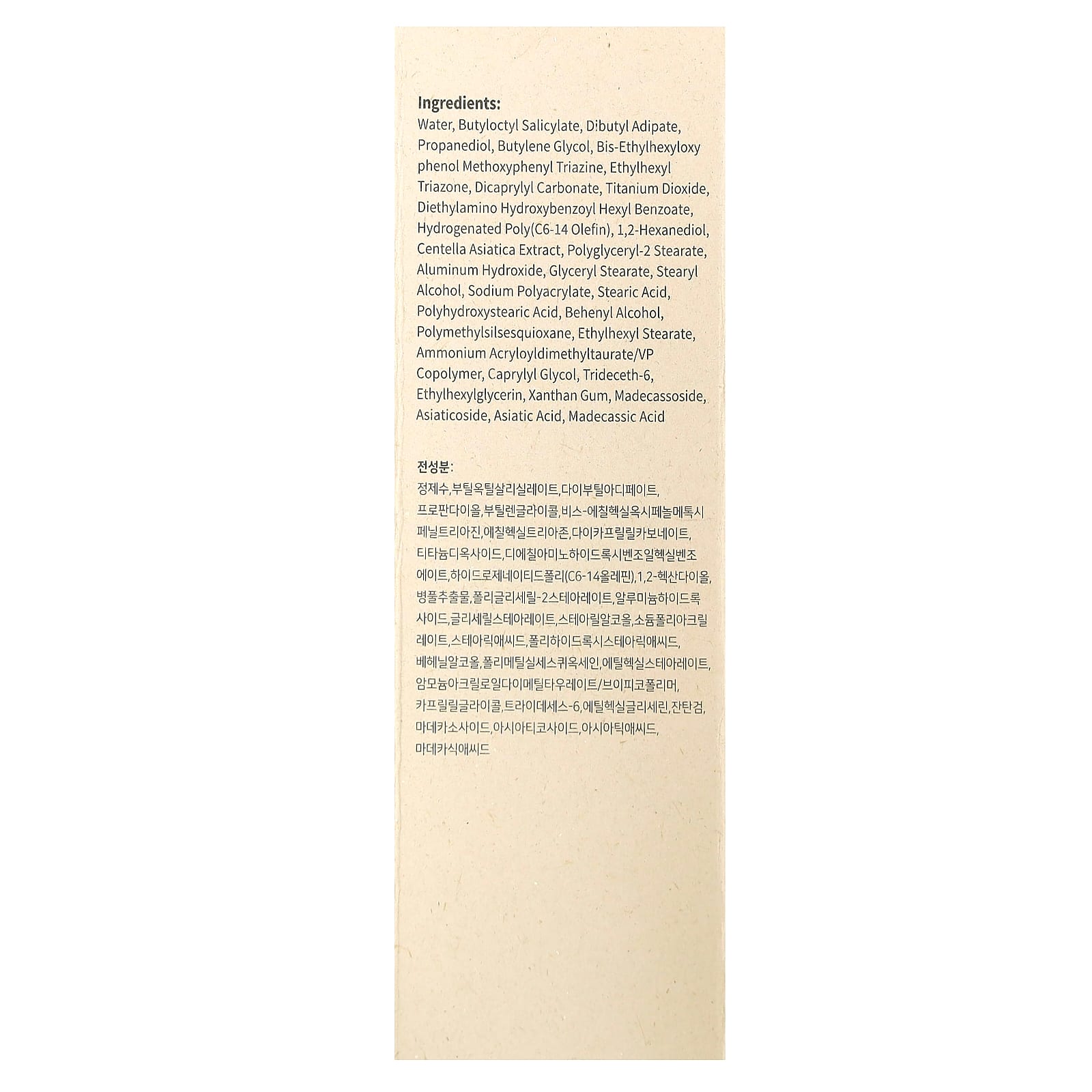 Вода, бутилоктилсалицилат, дибутил адипат, пропандиол, бутиленгликоль, бис-этилгексилоксифенол метоксифенил триазин, этилгексил триазон, дикаприлил карбонат, диоксид титана, диэтиламиногидроксибензоил гексил бензоат, гидрогенизированный поли (C6-14 олефин), 1,2-гександиол, экстракт готу колы (Centella asiatica), полиглицерил-2 стеарат, гидроксид алюминия, глицерил стеарат, стеариловый спирт, полиакрилат натрия, стеариновая кислота, полигидроксистеариновая кислота, бегениловый спирт, полиметилсилсесквиоксан, этилгексил стеарат, аммоний акрилоилдиметилтаурат/ВП сополимер, каприлилгликоль, тридецет-6, этилгексилглицерин, ксантановая камедь, мадекассосид, азиатикозид, азиатиковая кислота, мадекассовая кислота.