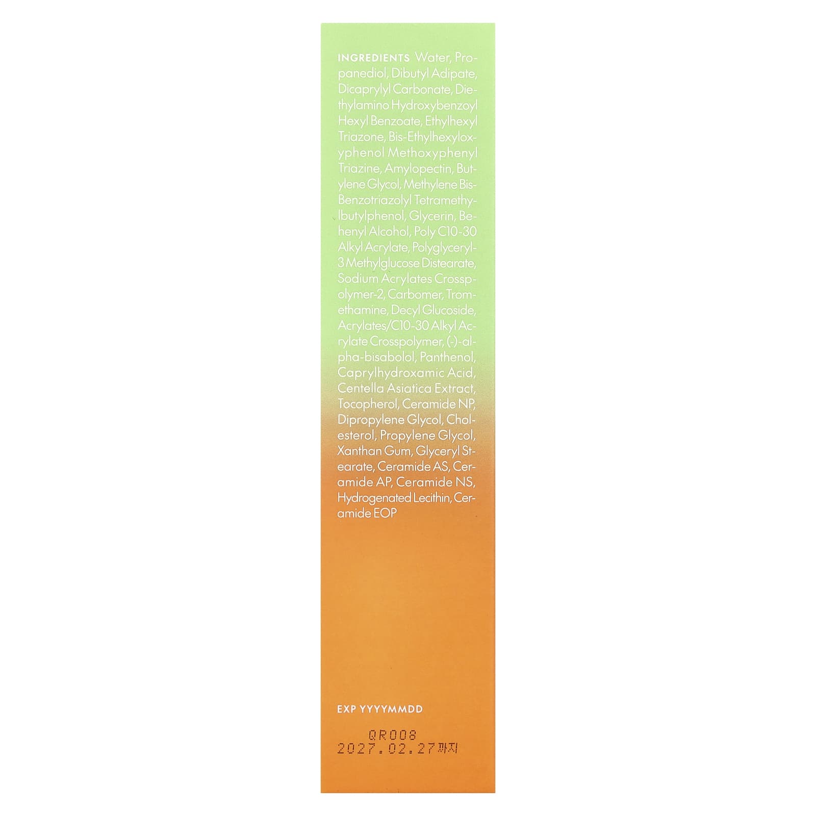 Вода, пропандиол, дибутиладипат, дикаприлил карбонат, диэтиламиногидроксибензоил гексилбензоат, этилгексил триазон, бис-этилгексилоксифенол, метоксифенилтриазин, амилопектин, бутиленгликоль, метилен бис-бензотриазолил тетраметилбутилфенол, глицерин, бегениловый спирт, поли c10-30 алкил акрилат, полиглицерил-3-метилглюкоза дистеарат, акрилат натрия кроссполимер-2, карбомер, трометамин, децил глюкозид, акрилат/c10-30 алкил акрилат кроссполимер, (-) - альфа-бисаболол, пантенол, каприлгидроксаминовая кислота, экстракт готу колы (Centella asiatica), токоферол, керамид NP, дипропиленгликоль, холестерина, пропиленгликоль, ксантановая камедь, глицерил стеарат, керамид в виде, керамид АP, керамид нс, гидрогенизированный лецитин, керамид эоп.