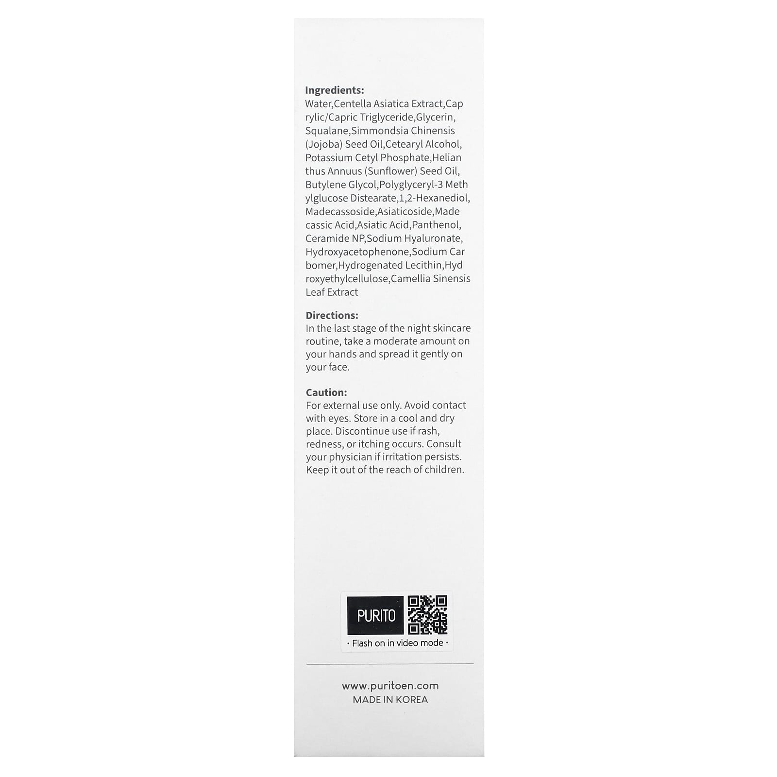Вода, экстракт готу колы (Centella asiatica), каприловый/каприновый триглицерид, глицерин, сквалан, масло из семян жожоба (Simmondsia chinensis), цетеариловый спирт, цетилфосфат калия, подсолнечное масло (Helianthus annuus), бутиленгликоль, полиглицерил-3 метилглюкозы дистеарат, 1,2-гександиол, мадекассосид, азиатикозид, мадекассовая кислота, азиатиковая кислота, пантенол, керамид NP, гиалуронат натрия, гидроксиацетофенон, карбомер натрия, гидрогенизированный лецитин, гидроксиэтилцеллюлоза, экстракт листьев зеленого чая (Camellia sinensis).