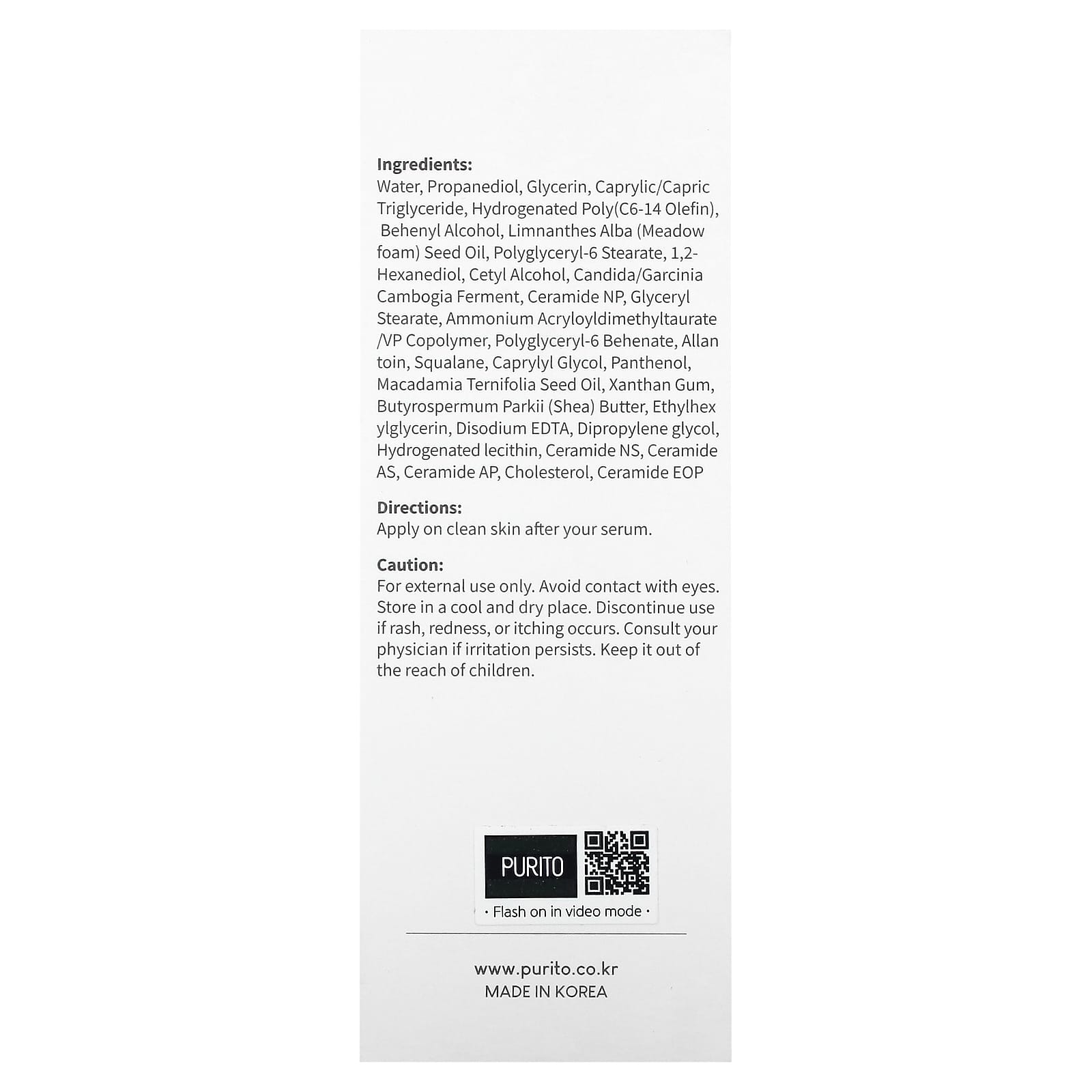 Вода, пропандиол, глицерин, каприловый/каприновый триглицерид, гидрогенизированный поли (C6-14 олефин), бегениловый спирт, масло семян пенника лугового (Limnanthes alba), полиглицерил-6 стеарат, 1,2-гександиол, цетиловый спирт, продукт ферментации гарцинии камбоджийской (Garcinia cambogia), керамид NP, глицерил стеарат, аммоний акрилоилдиметилтаурат/ВП сополимер, полиглицерил-6 бегенат, аллантоин, сквалан, каприлилгликоль, пантенол, масло макадамии (Macadamia ternifolia), ксантановая камедь, масло ши (Butyrospermum parkii), этилгексилглицерин, двунатриевая ЭДТК, дипропиленгликоль, гидрогенизированный лецитин, керамид NS, керамид AS, керамид АP, холестерин, керамид EOP.
