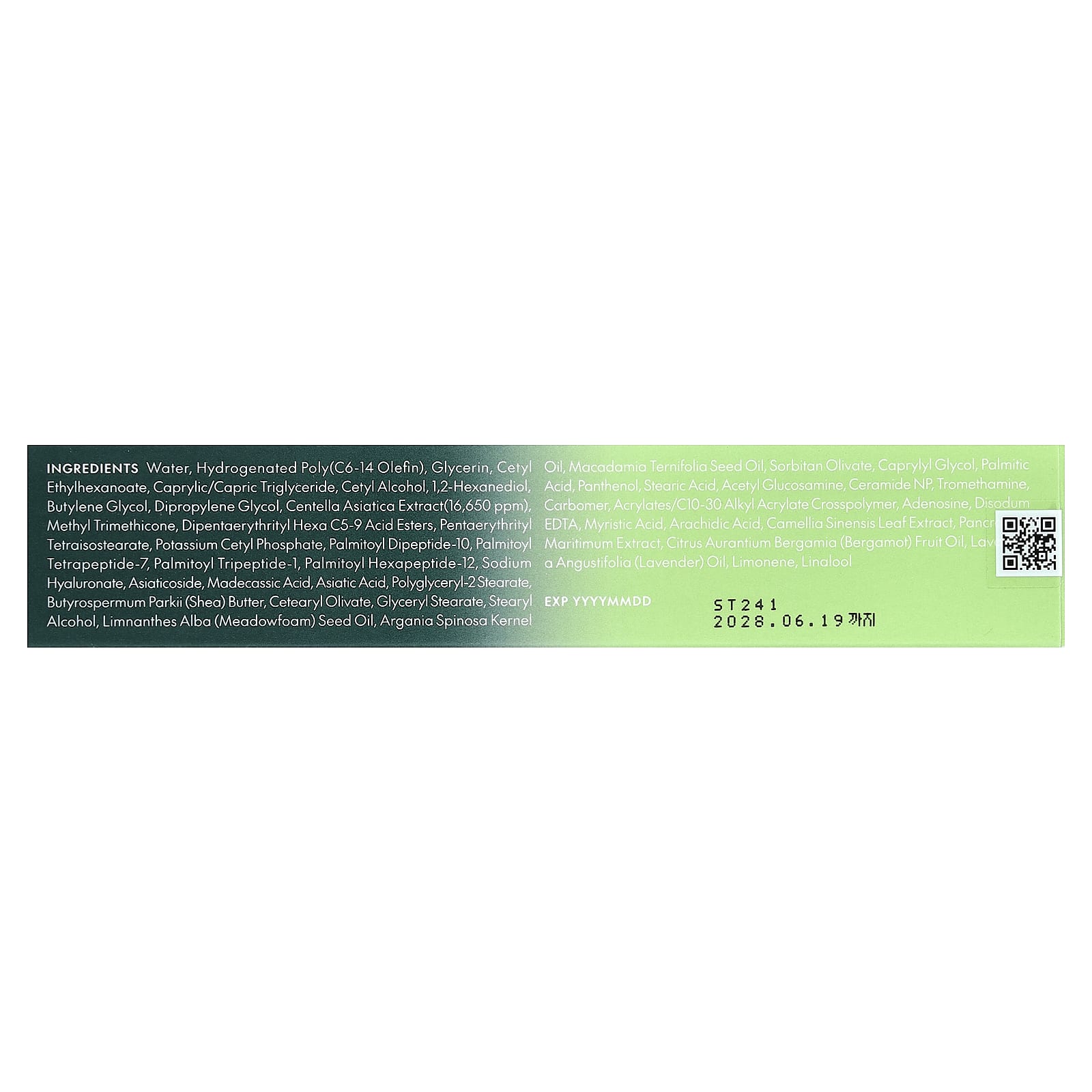 Вода, Гидрогенизированный полиполи (олефин C6-14), глицерин, цетилэтилгексаноат, каприловый/каприновый триглицерид, цетиловый спирт, 1,2-гександиол, бутиленгликоль, дипропиленгликоль, экстракт готу колы (Centella asiatica) (16 650 част./млн), метилтриметикон, дипентаэритрил гекса С5-9 кислотные эфиры, пентаэритритил тетраизостеарат, цетил фосфат калия, пальмитоил дипептид-10, пальмитоил тетрапептид-7, пальмитоил трипептид-1, пальмитоил гексапептид-12, гиалуронат натрия, Азиатикозид, Мадекассовая кислота, Азиатская кислота, полиглицерил-2 стеарат, Масло Butyrospermum parkii (Ши), цетеарилоливат, глицерил стеарат, стеариловый спирт, Масло семян Limnanthes alba (пенник луговой), Масло косточек аргании спинозы, Масло семян макадамии тернифолии, сорбитан оливат, каприлилгликоль, пальмитиновая кислота, пантенол, стеариновая кислота, ацетилглюкозамин, Керамид NP, трометамин, Карбомер, Акрилат/C10-30 Алкилакрилатный кроссполимер, аденозин, двудомная ЭДТК, миристиновая кислота, арахиновая кислота, Экстракт листьев камелии китайской, экстракт панкрация морского (Pancratium maritimum), масло бергамота (Citrus aurantium bergamia), лавандовое масло (Lavandula angustifolia), лимонен, линалоол.
