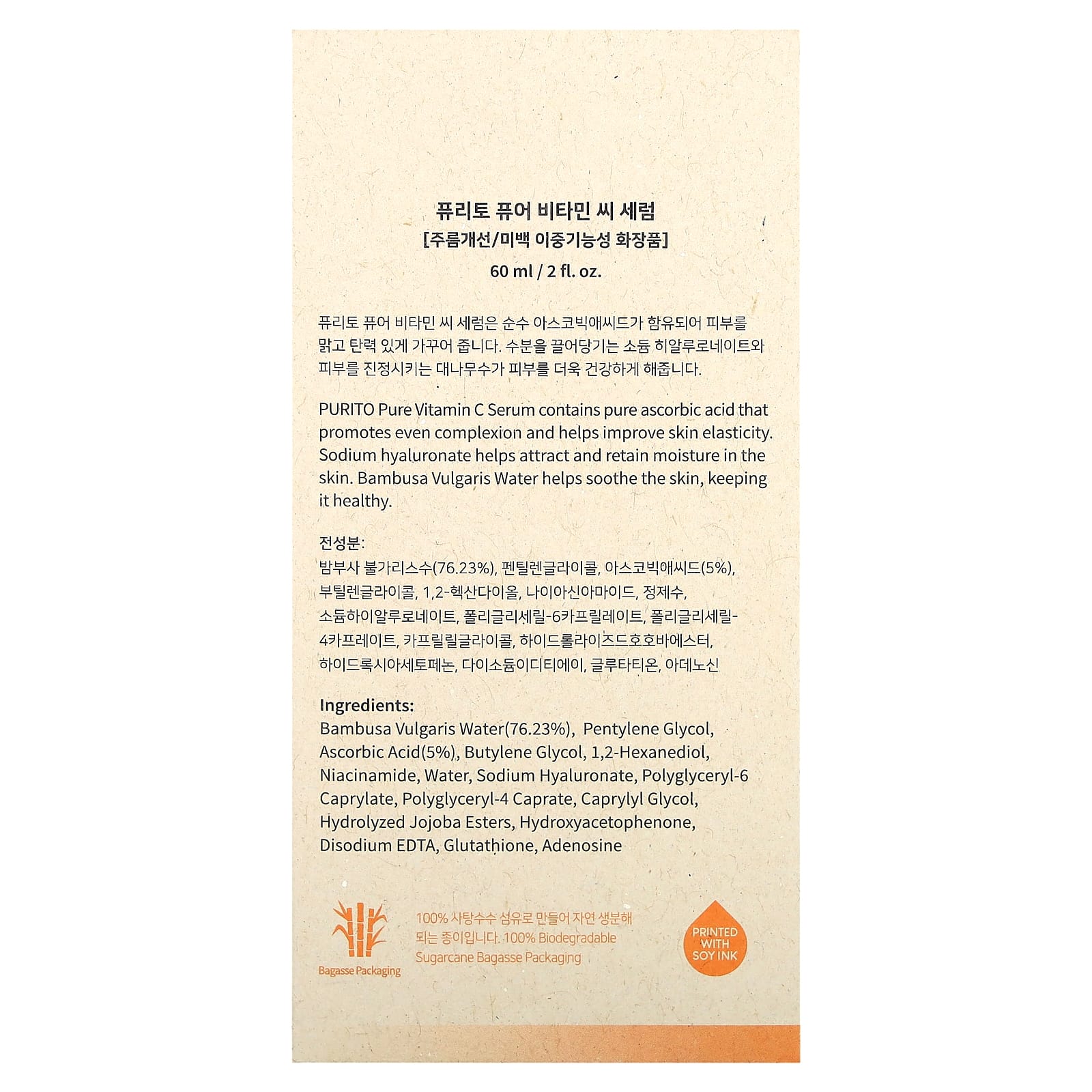 Бамбуковая вода (Bambusa vulgaris) (76,23%), пентилен гликоль, аскорбиновая кислота (5%), бутиленгликоль, 1,2-гександиол, никотинамид, вода, гиалуронат натрия, полиглицерил-6 каприлат, полиглицерил-4 капрат, каприлилгликоль, гидролизованные эфиры жожоба, гидроксиацетофенон, двунатриевая ЭДТК, глутатион, аденозин.
