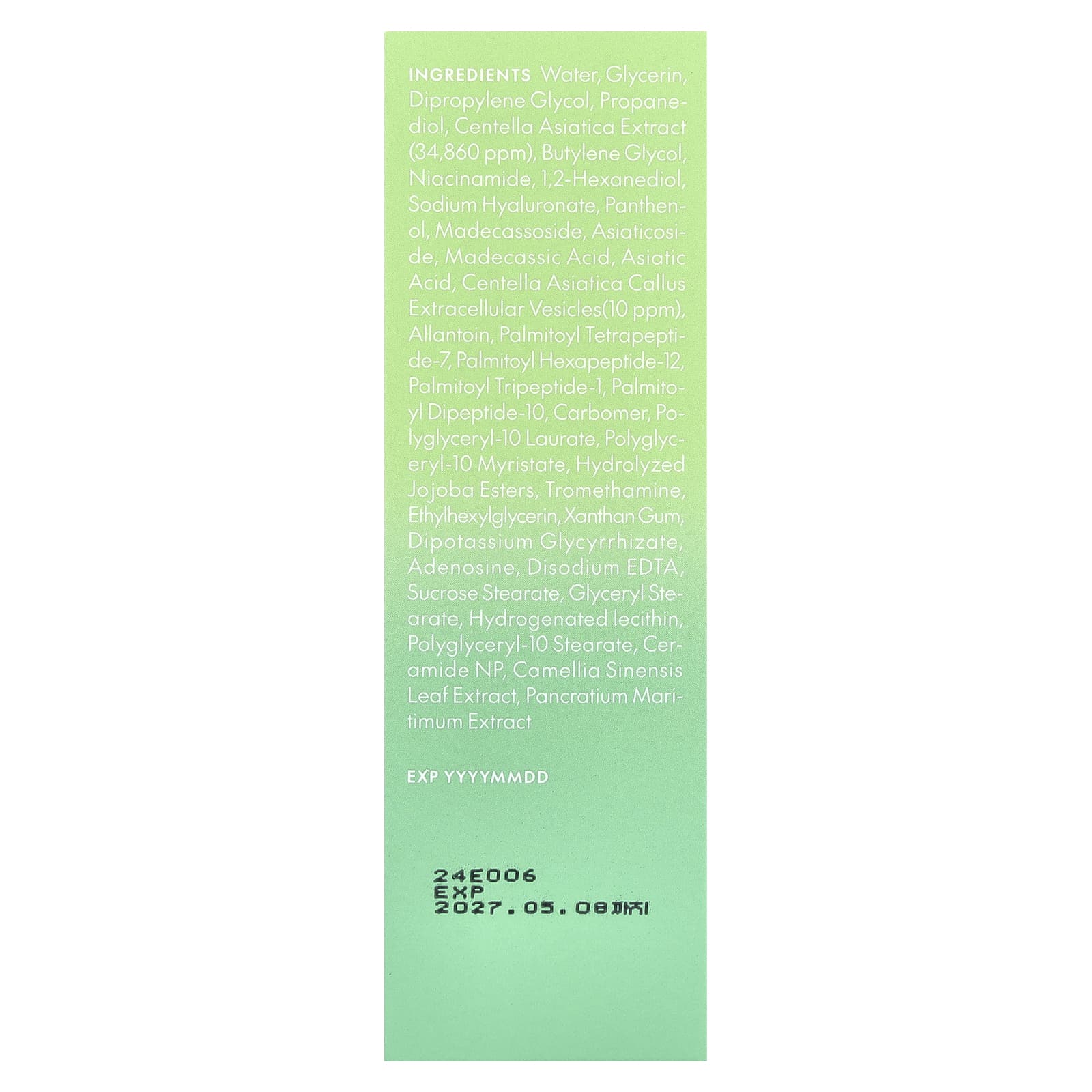Экстракт готу колы (Centella asiatica), вода, глицерин, дипропиленгликоль, никотинамид, бутиленгликоль, 1,2-гександиол, глицерет-26, керамид NP, гиалуронат натрия, азиатикозид, азиатиковая кислота, мадекассовая кислота, пальмитоил гексапептид-12, пальмитоил трипептид-1, пальмитоил тетрапептид-7, пальмитоил дипептид-10, карбомер, аргинин, смола склероций, гидролизованные эфиры жожоба, каприлилгликоль, полиглицерил-10 миристат, пантенол, полиглицерил-10 лаурат, гидрогенизированный лецитин, экстракт листьев зеленого чая (Camellia sinensis), экстракт панкрация морского (Pancratium maritimum), дикалия глицирризат, двунатриевая ЭДТК, аденозин.