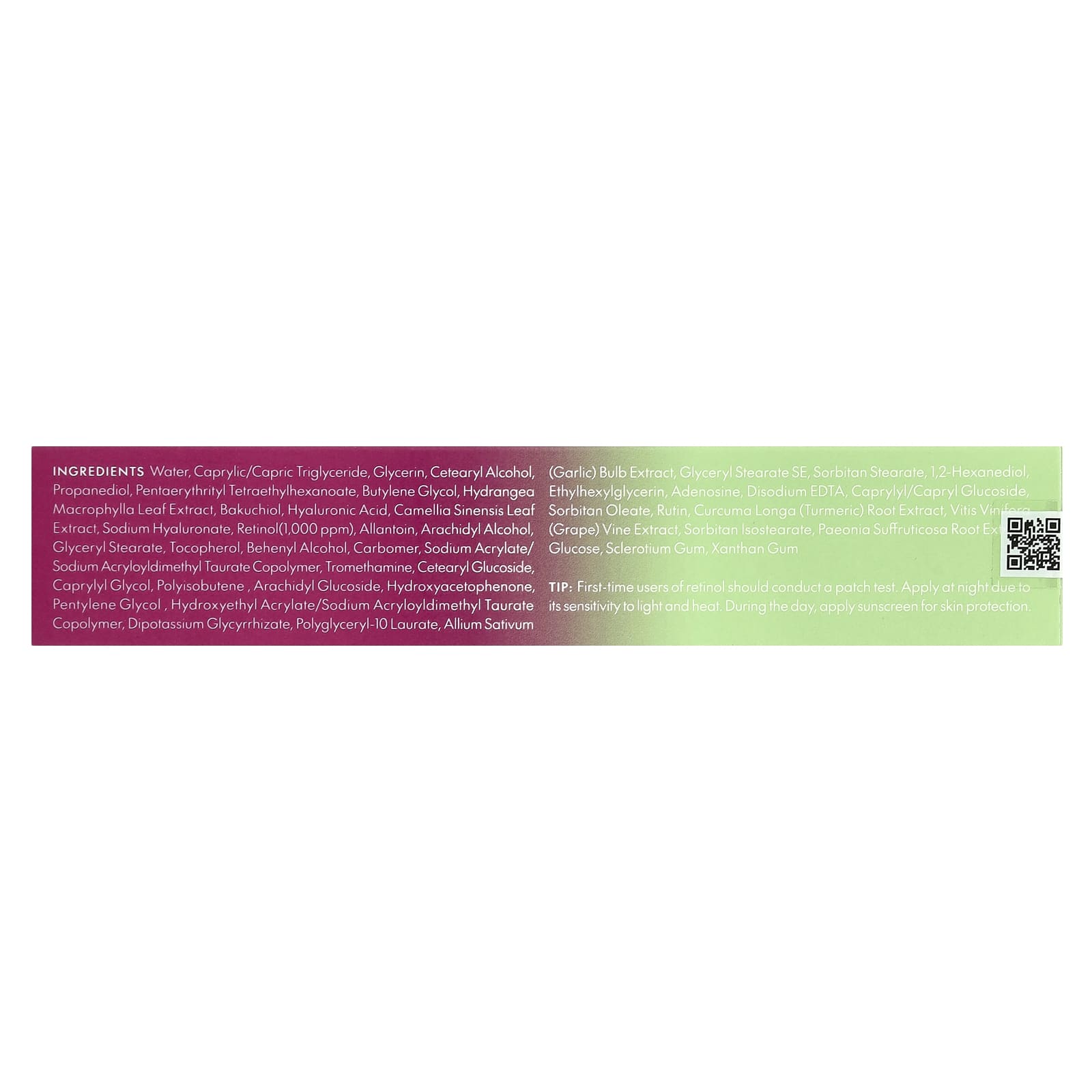 Вода, каприловый/каприновый триглицерид, глицерин, цетеариловый спирт, пропандиол, пентаэритритил тетраэтилгексаноат, бутиленгликоль, экстракт листьев гортензии крупнолистной, бакучиол, гиалуроновая кислота, экстракт листьев зеленого чая (Camellia sinensis), гиалуронат натрия, ретинол (1000 част. / млн), аллантоин, арахидиловый спирт, глицерил стеарат, токоферол, бегениловый спирт, карбомер, акрилат натрия / акрилоилдиметилтаурат натрия, трометамин, цетеариловый глюкозид, каприлилгликоль, полиизобутен , арахидиловый глюкозид, гидроксиацетофенон, пентилен гликоль , гидроксиэтил акрилат/натрия акрилоилдиметилтаурата сополимер, дикалия глицирризат, полиглицерил-10 лаурат, экстракт луковиц чеснока (Allium sativum), глицерил стеарат эмульгирующий, сорбитан стеарат, 1,2-гександиол, этилгексилглицерин, аденозин, двунатриевая ЭДТК, каприлил/каприл глюкозид, сорбитанолеат, рутин, экстракт корня куркумы (Curcuma longa), vitis vinifera (виноградная лоза), сорбитан изостеарат, экстракт корня пиона (Paeonia suffruticosa), глюкоза, смола склероций, ксантановая камедь.