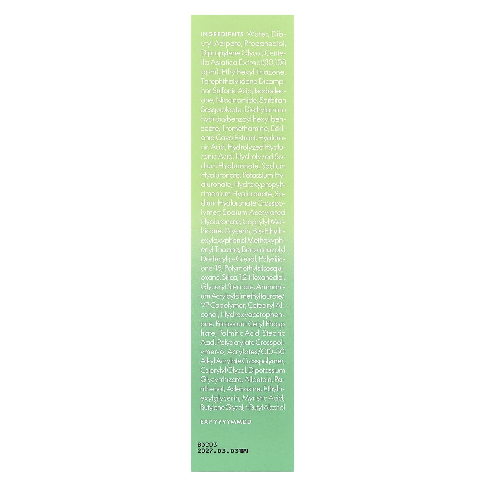 Вода, дибутиладипат, пропандиол, дипропиленгликоль, экстракт центеллы азиатской (30108 част. / млн), этилгексил триазон, терефталиден дикамфорсульфоновая кислота, изододекан, никотинамид, сорбитана сесквиолеат, диэтиламиногидроксибензоил гексилбензоат, трометамин, экстракт водоросли эклонии кавы (Ecklonia cava), гиалуроновая кислота, гидролизованная гиалуроновая кислота, гидролизованный гиалуронат натрия, гиалуронат натрия, гиалуронат калия, гиалуронат гидроксипропилтримония, кроссполимер гиалуроната натрия, ацетилированный гиалуронат натрия, каприлил метикон, глицерин, бис-этилгексилоксифенол, метоксифенилтриазин, бензотриазолил додецил п-крезол, полисиликон-15, полиметилсилсесквиоксан, диоксид кремния, 1,2-гександиол, глицерил стеарат, аммоний акрилоилдиметилтаурат/ВП сополимер, цетеариловый спирт, гидроксиацетофенон, цетил фосфат калия, пальмитиновая кислота, стеариновая кислота, полиакрилата кроссполимер-6, акрилат/c10-30 алкил акрилат кроссполимер, каприлилгликоль, дикалия глицирризат, аллантоин, пантенол, аденозин, этилгексилглицерин, миристиновая кислота, бутиленгликоль, т-бутиловый спирт.