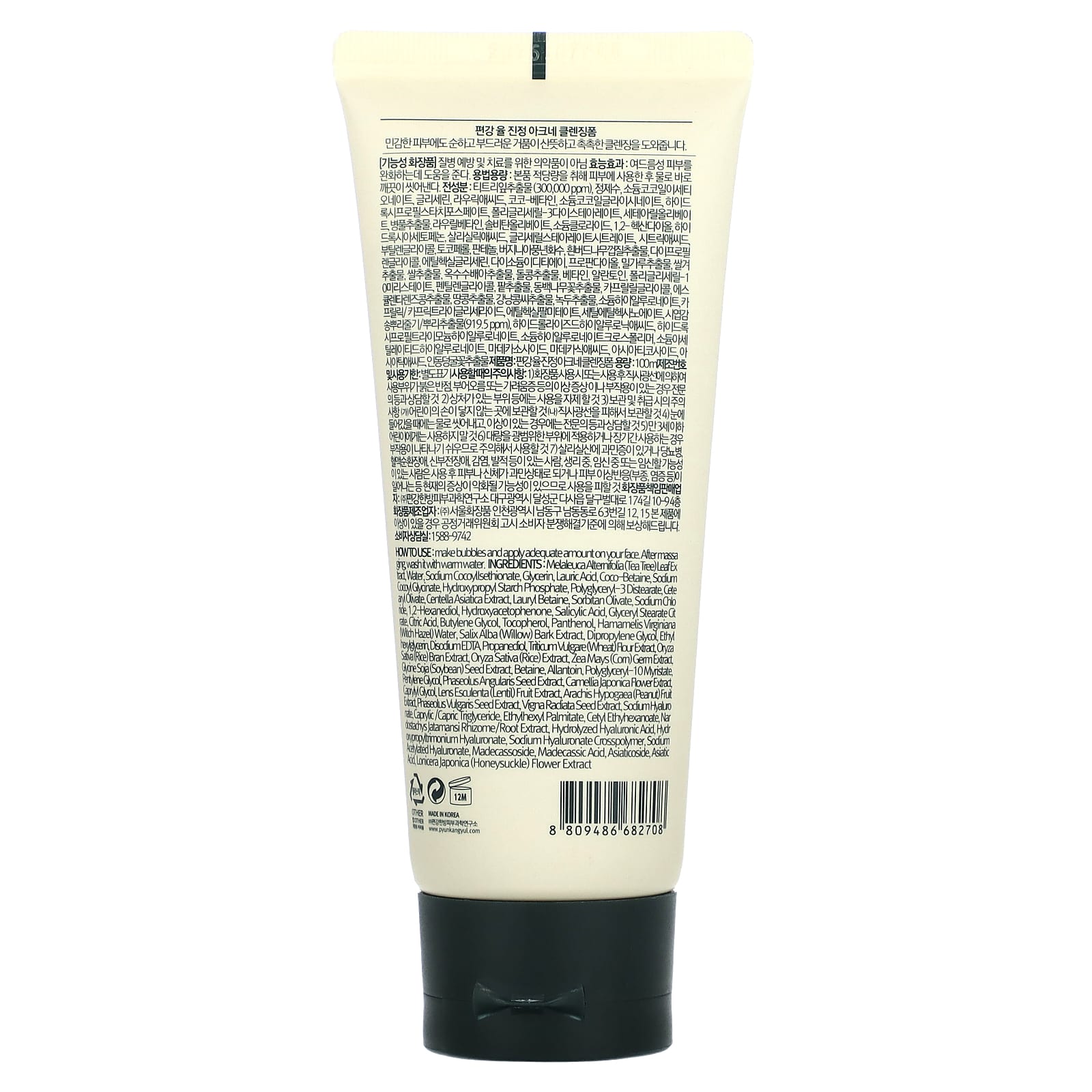 Экстракт листьев чайного дерева (Melaleuca alternifolia), вода, кокоиллцетионат натрия, глицерин, лауриновая кислота, коко-бетаин, кокоил глицинат натрия, гидроксипропил фосфат крахмала, полиглицерил-3 дистеарат, цетеарил оливат, экстракт готу колы (Centella asiatica), лаурил бетаин, сорбитан оливат, хлорид натрия, 1,2-гександиол, гидроксиацетофенон, салициловой кислоты, глицерил стеарат цитрат, лимонная кислота, бутиленгликоль, токоферол, пантенол, вода из гамамелиса (Hamamelis virginiana), экстракт коры ивы (Salix alba), дипропиленгликоль, этилгексилглицерин, двунатриевая ЭДТК, пропандиол, экстракт пшеницы (Triticum vulgare), экстракт рисовых отрубей (Oryza sativa), экстракт риса (Oryza sativa), экстракт зародышей zea mays (com), экстракт соевых бобов (Glycine soja), бетаин, аллантоин, полиглицерил-10 миристат, пертиленгликоль, экстракт зерен адзуки (Phaseolus angularis), экстракт цветков камелии японской (Camellia japonica), каприлилгликоль, экстракт чечевицы (Lens esculenta), экстракт арахиса (Arachis hypogaea), экстракт семян фасоли (Phaseolus vulgaris), экстракт семян маша (Vigna radiata), гиалуронат натрия, каприловый/каприновый триглицерид, этилгексил пальмитат, цетилэтилгексаноат, экстракт корневища / корня Nardostachys jatamansi, гидролизованная гиалуроновая кислота, гидроксипропилтримония гиалуронат, гиалуронат натрия кроссполимер, ацетилированный гиалуронат натрия, мадекассосид, мадекассовая кислота, азиатикозид, азиатиковая кислота, экстракт цветков жимолости (Lonicera japonica).