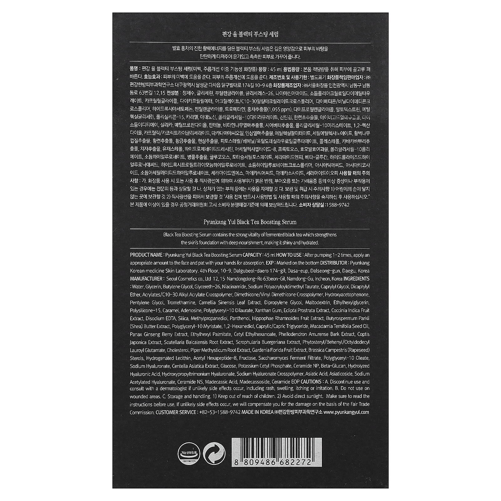 Вода, глицерин, бутиленгликоль, глицерет-26, Ниацинамид, полиакрилодиметил таурат натрия, каприлилгликоль, дикаприлиловый эфир, Акрилат/C10-30 Алкилакрилатный кроссполимер, Кроссполимер диметикона/винилдиметикона, гидроксиацетофенон, пентиленгликоль, трометамин, Экстракт листьев камелии китайской, дипропиленгликоль, мальтодекстрин, этилгексилглицерин, полисиликон-15, карамель, аденозин, полиглицерил-10 дилаурат, Ксантановая камедь, экстракт эклипты простертой (Eclipta prostrata), экстракт плодов кокцинии индийской (Coccina indica), Динатрия ЭДТА, кремнезем, метилпропандиол, пантенол, экстракт плодов облепихи крушиновидной (Hippophae rhamnoides), экстракт масла ши (Butyrospermum parkii), полиглицерил-10 миристат, 1,2-гександиол, каприловый/каприновый триглицерид, Масло семян макадамии тернифолии, экстракт ягод женьшеня обыкновенного (Panax ginseng), этилгексил пальмитат, цетилэтилгексаноат, экстракт коры амурского бархата (Phellodendron amurense), Экстракт коптиса японского, экстракт корня шлемника (Scutellaria baicalensis), экстракт кабана (Scrophularia buergeriana), фитостерил/бегенил/октилдодецил лауроил глутамат, холестерин, экстракт корня перца (Piper methysticum), Экстракт плодов гардении флориды, рапсовые стеролы (Brassica campestris), Гидрогенизированный лецитин, ацетил гексапептид-8, фруктоза, продукт ферментации дрожжевых грибков-сахаромицетов, полиглицерил-10 олеат, гиалуронат натрия, Экстракт центеллы азиатской, глюкоза, цетил фосфат калия, Керамид NP, бета-глюкан, гидролизованная гиалуроновая кислота, гидроксипропилтримония гиалуронат, кроссполимер гиалуроната натрия, Азиатская кислота, Азиатикозид, ацетилированный гиалуронат натрия, Керамид NS, Мадекассовая кислота, Мадекассозид, керамид EOP