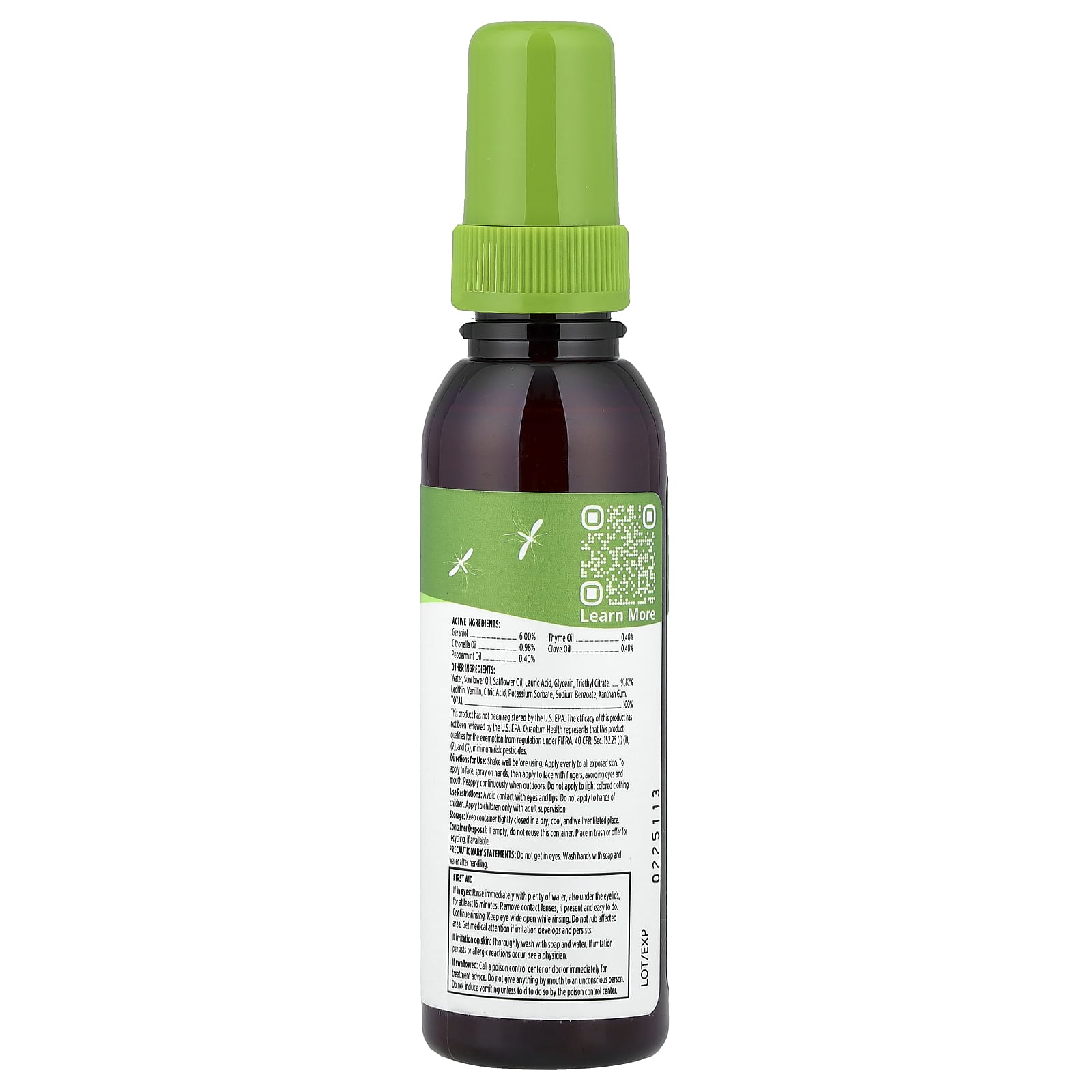 Активные ингредиенты: Гераниол (6%), цитронелла (0,98%), масло перечной мяты (0,40%), масло чабреца (0,40%), гвоздичное масло (0,40%).