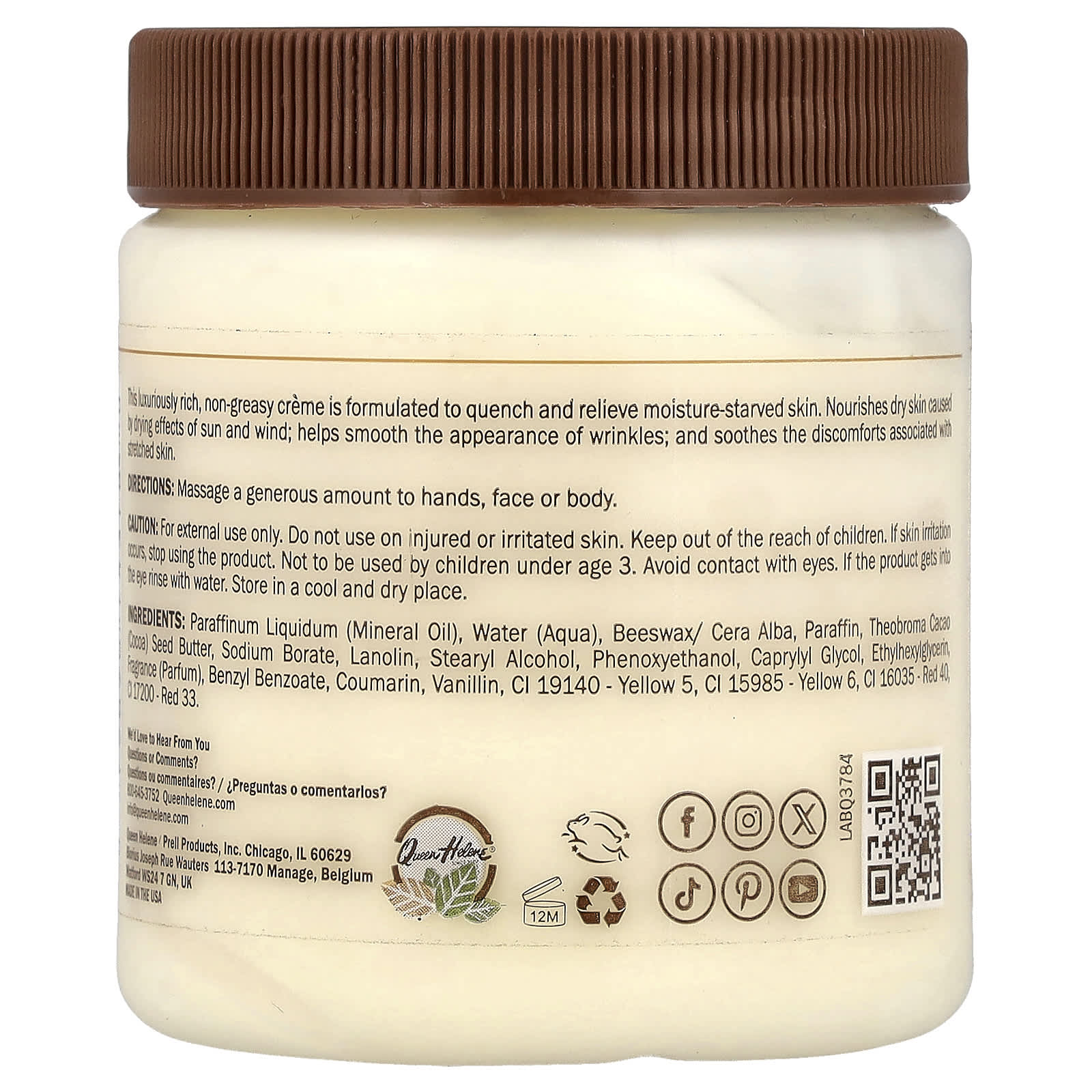 Вазелиновое масло (Paraffinum liquidum), вода (Aqua), пчелиный воск (Cera alba), парафина, масло из зёрен какао (Theobroma cacao), борат натрия, ланолин, стеариловый спирт, феноксиэтанол, каприлилгликоль, этилгексилглицерин, отдушка (парфюмерная композиция), бензилбензоат, кумарин, ванилин, CI 19140, краситель желтый 5, CI 15985, краситель жёлтый 6, CI 16035, краситель красный 40, CI17200, краситель красный 33.