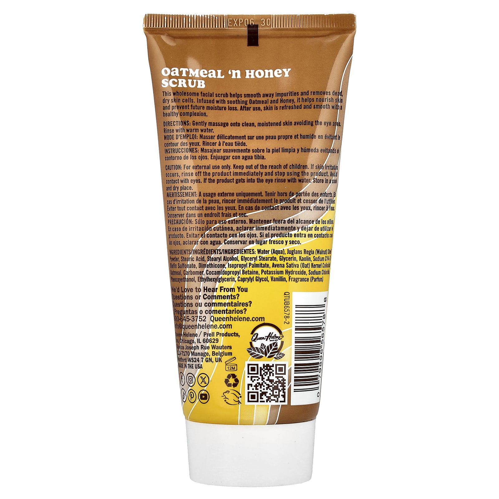 Вода, порошок из скорлупы грецкого ореха (Juglans regia), стеариновая кислота, стеариловый спирт, глицерил стеарат, глицерин, каолин, натрия С14-16 олефин сульфонат, диметикон, изопропилпальмитат, коллоидная овсянка из ядер овса (Avena sativa), карбомер, кокамидопропилбетаин, гидроксид калия, хлорид натрия, феноксиэтанол, этилгексилглицерин, каприлилгликоль, ванилин, отдушка (парфюмерная композиция).