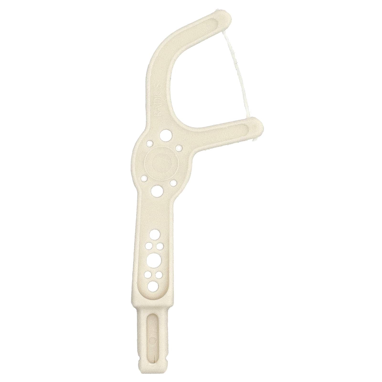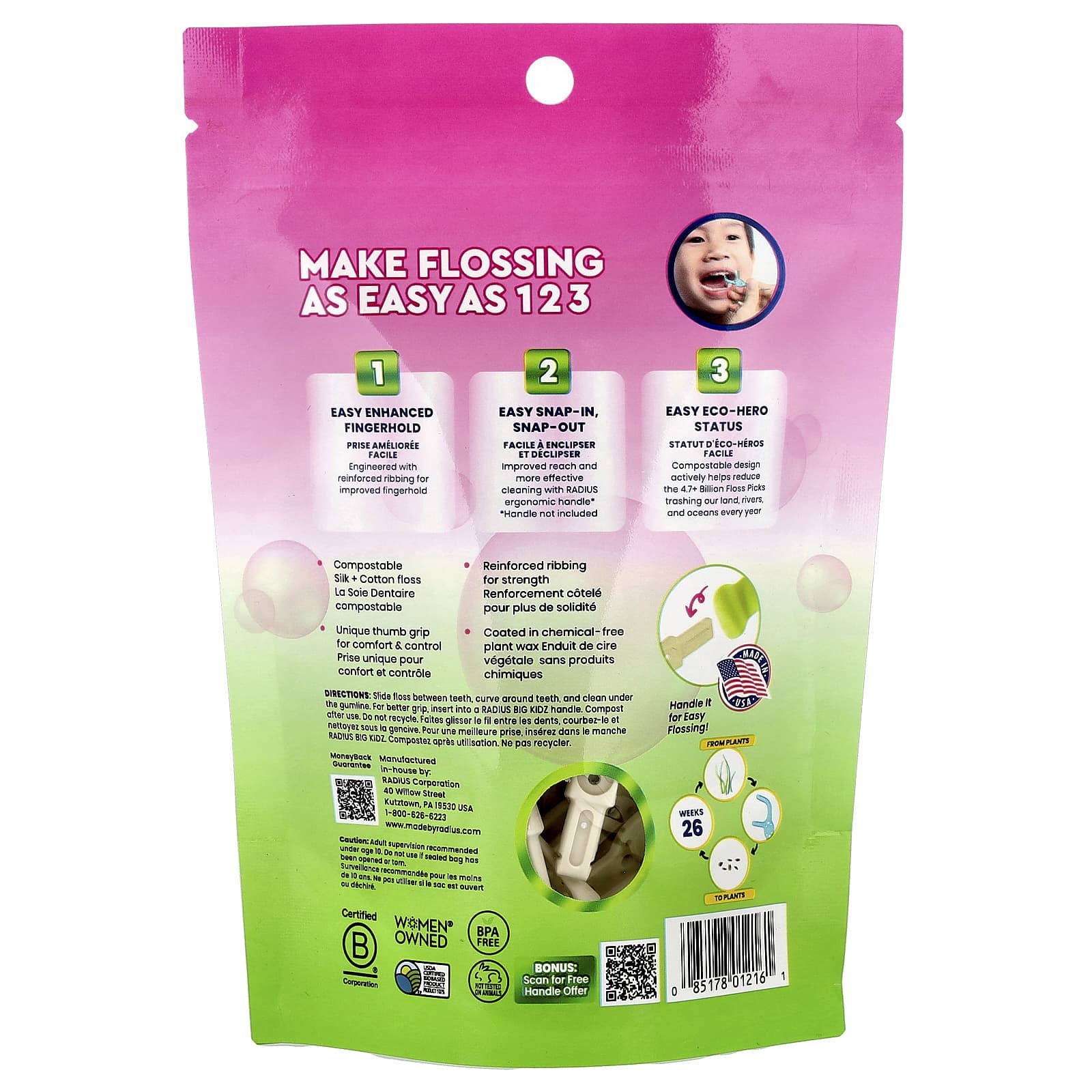 Проведите нитью между зубами, обхватите зубную нить и очистите поверхность под линией десен. Для лучшего захвата вставьте в ручку RADIUS BIG KIDZ. Компост после использования. Не подвергать вторичной переработке.