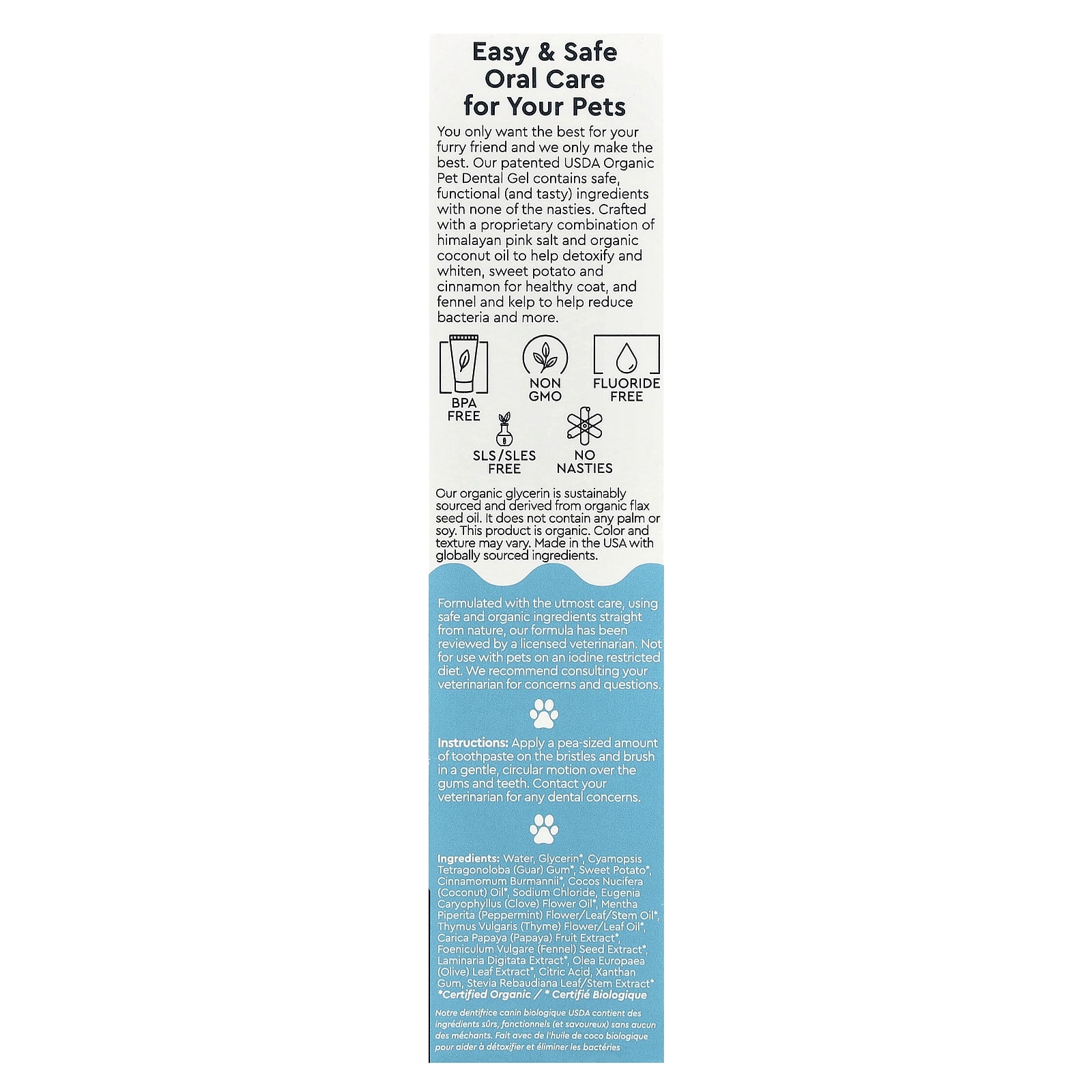 Вы хотите только лучшего для своего пушистого друга, а мы делаем только лучшее. Наш запатентованный органический гель для полости рта для домашних животных (USDA Organic Pet Dental Gel) содержит безопасные, функциональные (и вкусные) ингредиенты без каких-либо неприятных запахов. Изготовлено из запатентованного сочетания розовой гималайской соли и органического кокосового масла для детоксикации и отбеливания, батата и корицы для здоровья шерсти, а также фенхеля и бурых водорослей для уменьшения количества бактерий и многого другого.