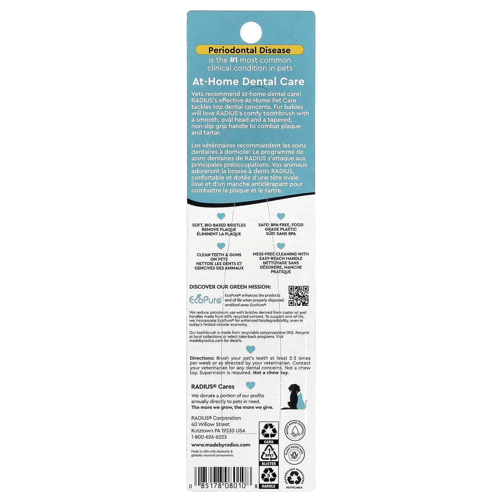 Ветеринары рекомендуют уход за зубами в домашних условиях! Эффективная система ухода за домашними животными от RADIUS решает самые серьезные стоматологические проблемы. Малышам с мехом понравится удобная зубная щетка RADIUS с гладкой овальной головкой и зауженной нескользящей ручкой для борьбы с зубным налетом и зубным камнем.