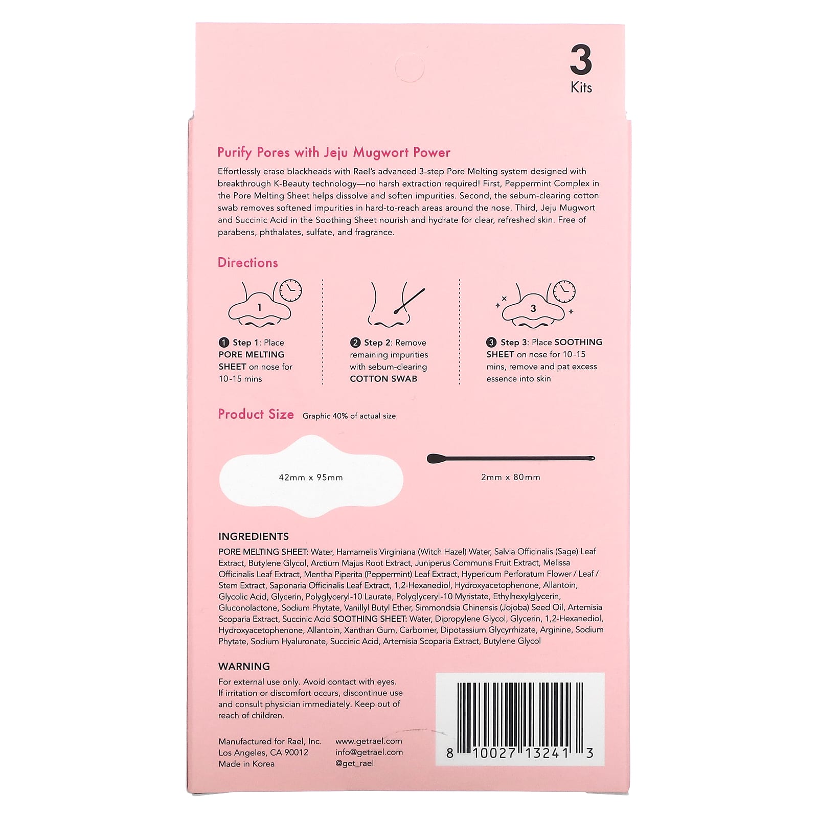 Легко удаляйте черные точки с помощью усовершенствованной трехэтапной системы плавления пор Rael, разработанной с использованием революционной технологии K-Beauty - не требует резкого удаления волос! Во-первых, комплекс Pore Melting Sheet помогает растворять и смягчать загрязнения. Во-вторых, очищающий кожный жир ватный диск удаляет размягченные загрязнения в труднодоступных участках вокруг носа. В-третьих, полынь Чеджу и янтарная кислота в составе успокаивающего полотна питают и увлажняют кожу, делая ее чистой и свежей. Не содержит парабенов, фталатов, сульфатов и отдушек.