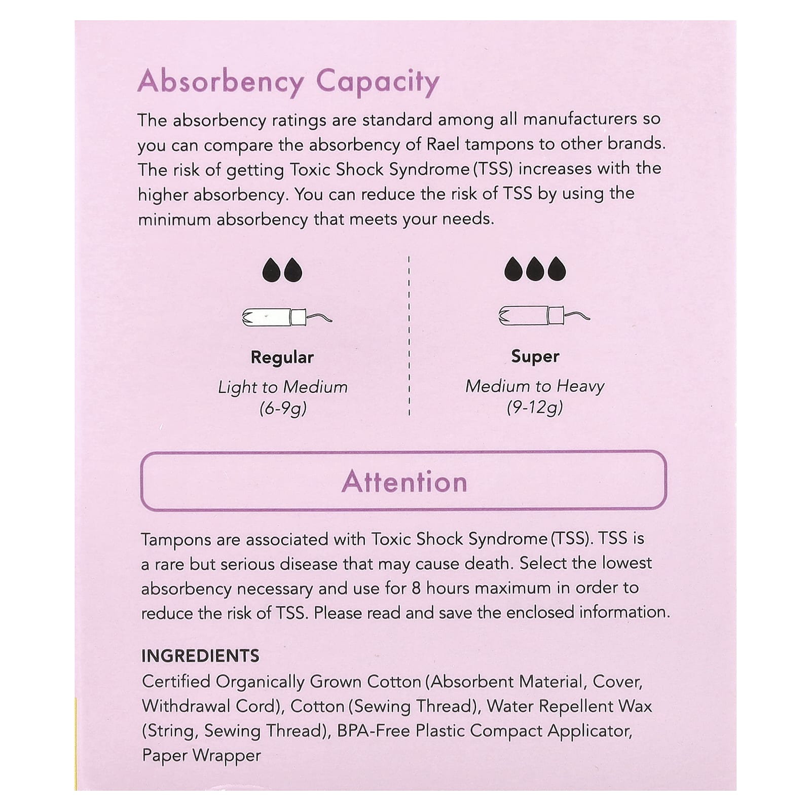 Рейтинг впитываемости является стандартным для всех производителей, поэтому вы можете сравнить впитывающую способность тампонов Rael с другими брендами. Риск развития синдрома токсического шока (СТШ) увеличивается с увеличением впитываемости. Вы можете снизить риск TSS, используя минимальную впитывающую способность, соответствующую вашим потребностям.