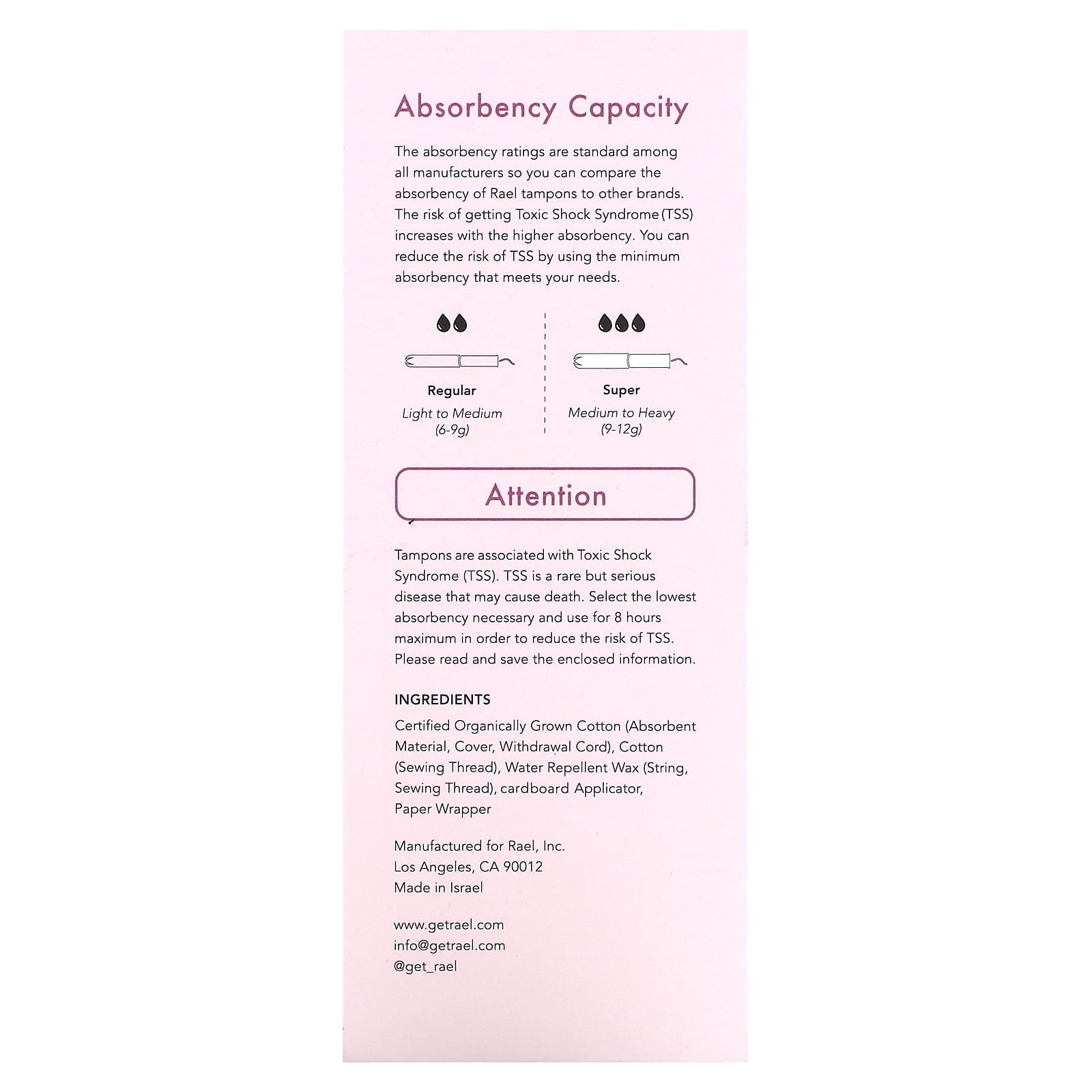 Рейтинг впитываемости является стандартным для всех производителей, поэтому вы можете сравнить впитывающую способность тампонов Rael с другими брендами. Риск развития синдрома токсического шока (СТШ) увеличивается вместе с увеличением впитывающей способности. Вы можете снизить риск СТШ, используя тампоны с минимальной впитывающей способностью, соответствующей вашим потребностям.