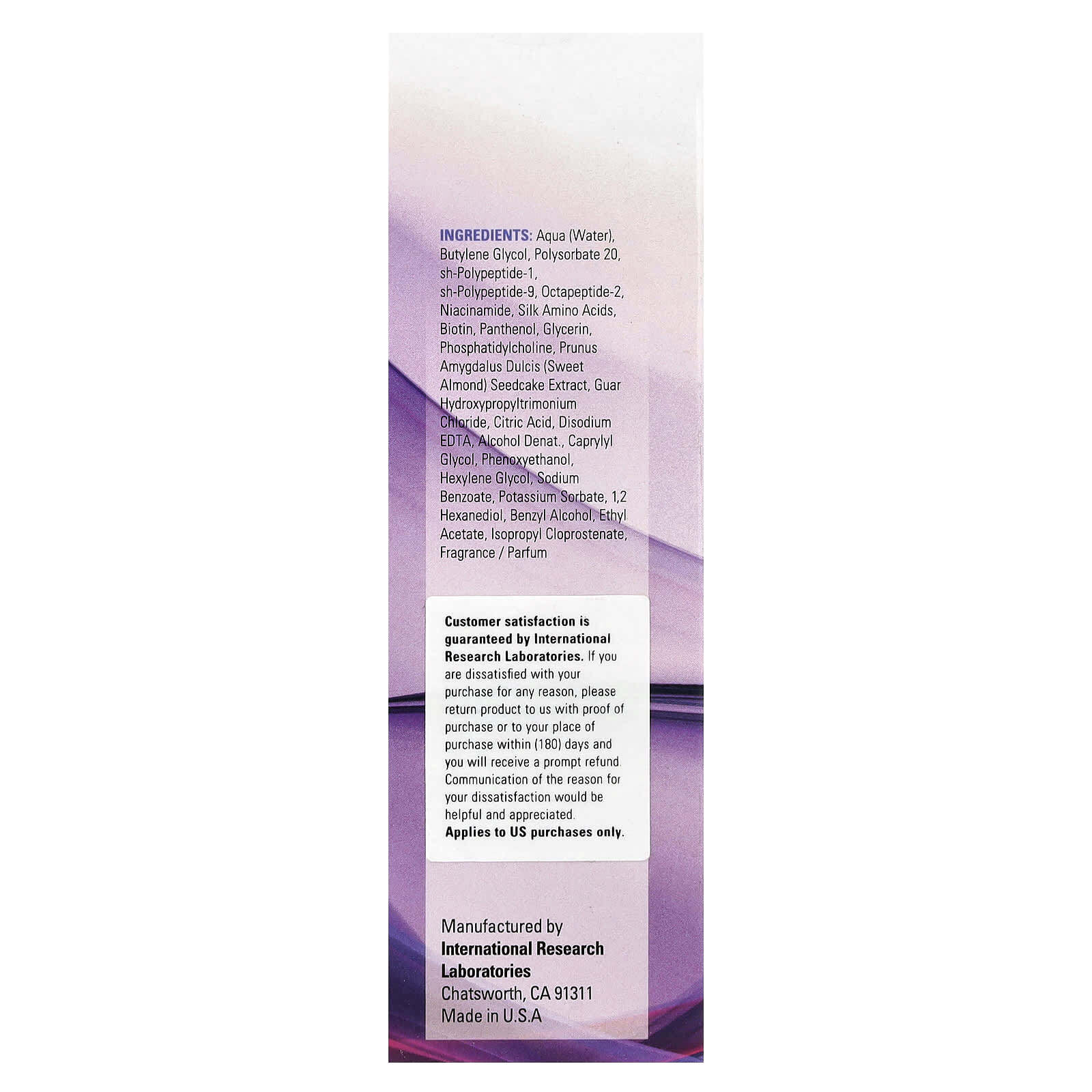 Вода, бутиленгликоль, полисорбат 20, sh-полипептид-1, sh-полипептид-9, октапептид-2, никотинамид, аминокислоты шёлка, биотин, пантенол, глицерин, фосфатидилхолин, экстракт сладкого миндаля (Prunus amygdalus dulcis), гуар гидроксипропилтримония хлорид, лимонная кислота, двунатриевая ЭДТК, денатурированный спирт, каприлилгликоль, феноксиэтанол, гексиленгликоль, бензоат натрия, сорбат калия, 1,2-гександиол, бензиловый спирт, этилацетат, изопропил клопростенат, отдушка.