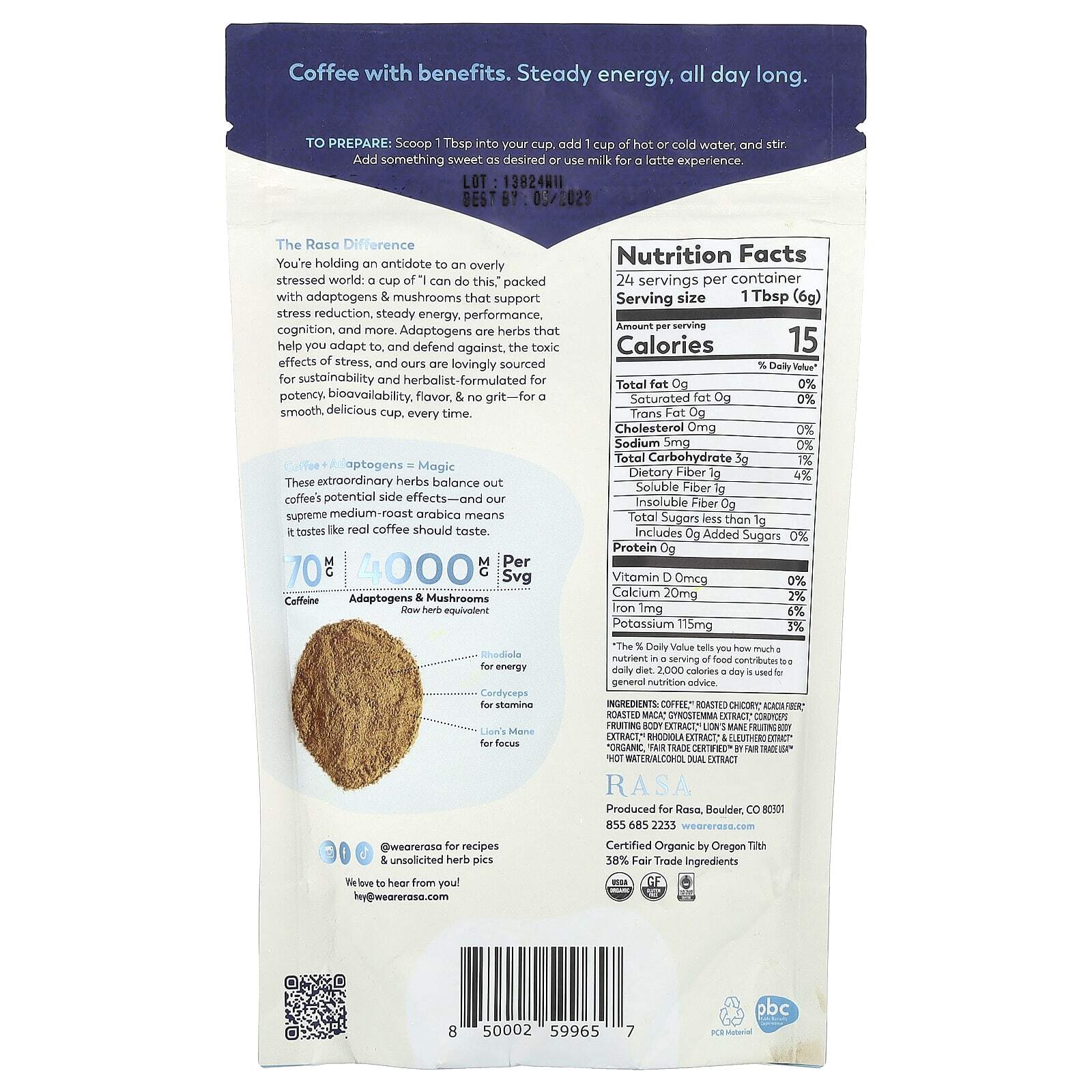 Кофе * †, жареный цикорий *, клетчатка акации * обжаренная мака *, экстракт гиностеммы *, экстракт плодового тела кордицепса * ‡, экстракт плодового тела львиной гривы * ‡, экстракт родиолы *, & amp; экстракт элеутерококка *.