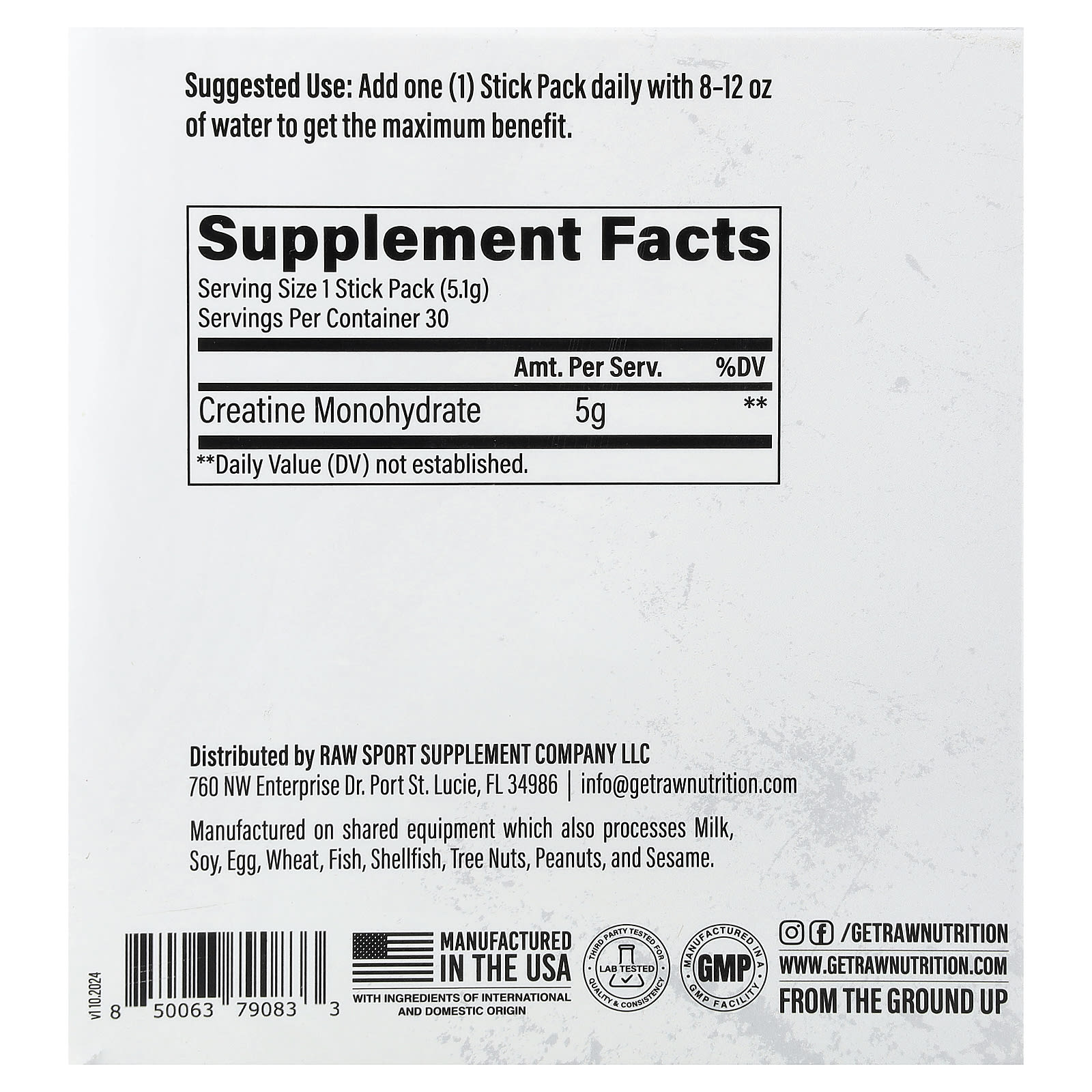 Производится на оборудовании, которое также используется для переработки молока, соя, яйца, пшеница, рыба, моллюски, древесные орехи, арахис, кунжут.