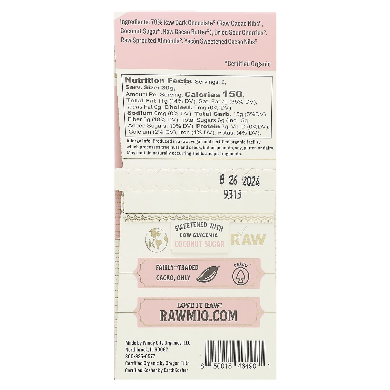 Необработанный шоколад, измельченный на косточках, с хрустящим проросшим миндалем и терпко-сладкой вишней.