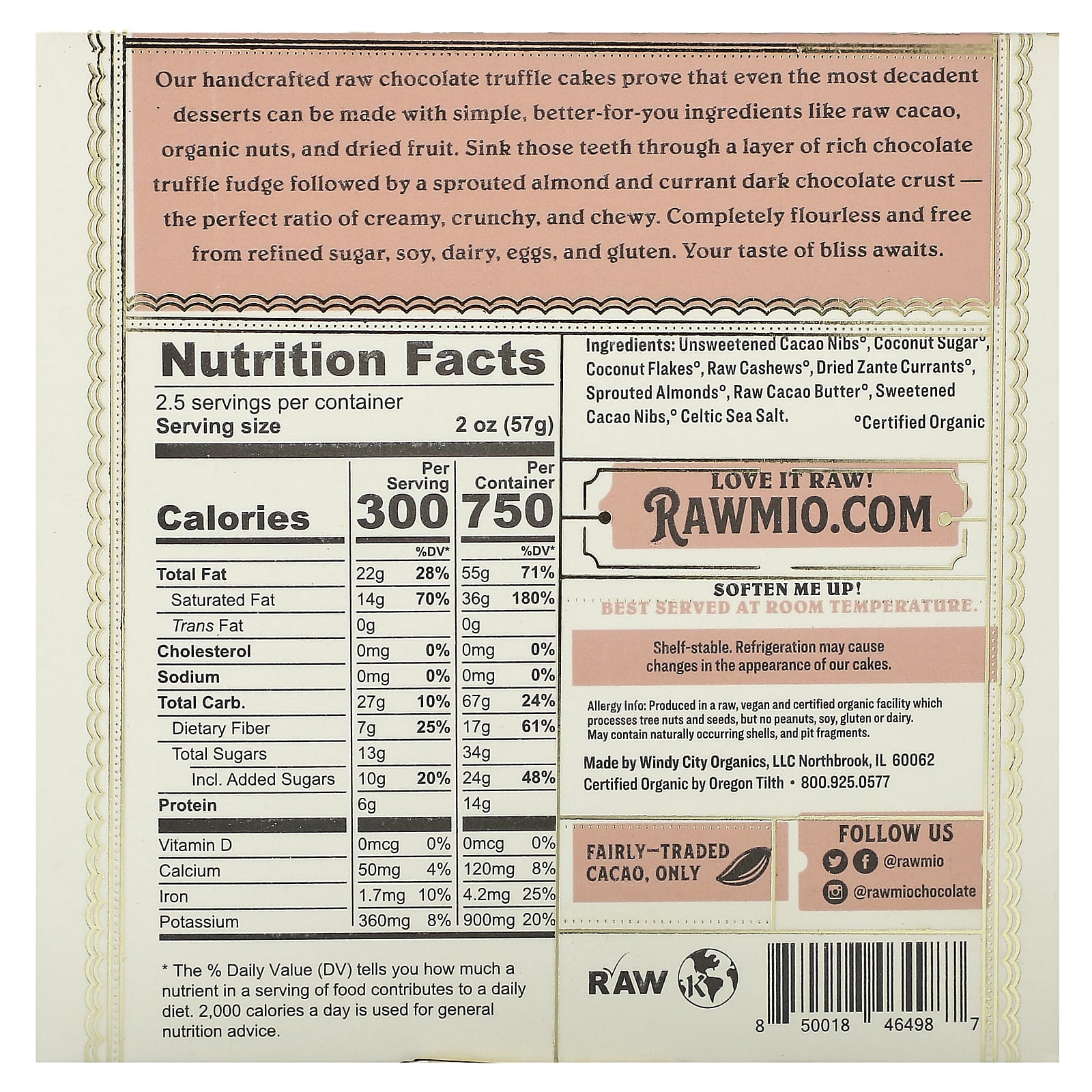 Наши изготовленные вручную трюфельные пирожные с необработанным шоколадом доказывают, что даже самые изысканные десерты можно приготовить из простых и полезных ингредиентов, таких как необработанное какао, органические орехи и сухофрукты. Побалуйте себя идеальным соотношением сливочного вкуса, хруста и мягкости, попробовав насыщенную шоколадную помадку с трюфелем с корочкой из темного шоколада с пророщенным миндалем и смородиной. Продукт не содержит муки, рафинированного сахара, сои, молочных продуктов, яиц и глютена. Ваш вкус блаженства.