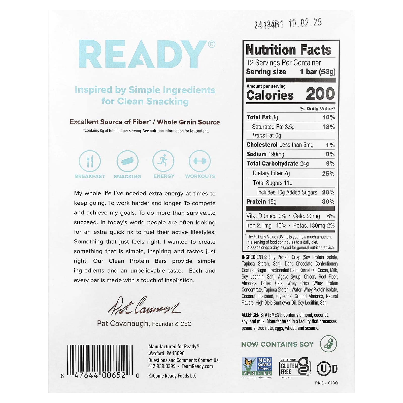 Хрустящий соевый протеин (изолят соевого протеина, тапиоковый крахмал, соль), кондитерская глазурь из темного шоколада (сахар, фракционированное пальмоядровое масло, какао, молока, соевый лецитин, соль), сироп агавы, клетчатка из корня цикория, миндаль, плющеная овсянка, сывороточный протеин, тапиоковый крахмал), вода, изолят сывороточного протеина, кокос, льняное семя, глицерин, молотый миндаль, натуральные ароматизаторы, подсолнечное масло с высоким содержанием олеина, соевый лецитин, соль.