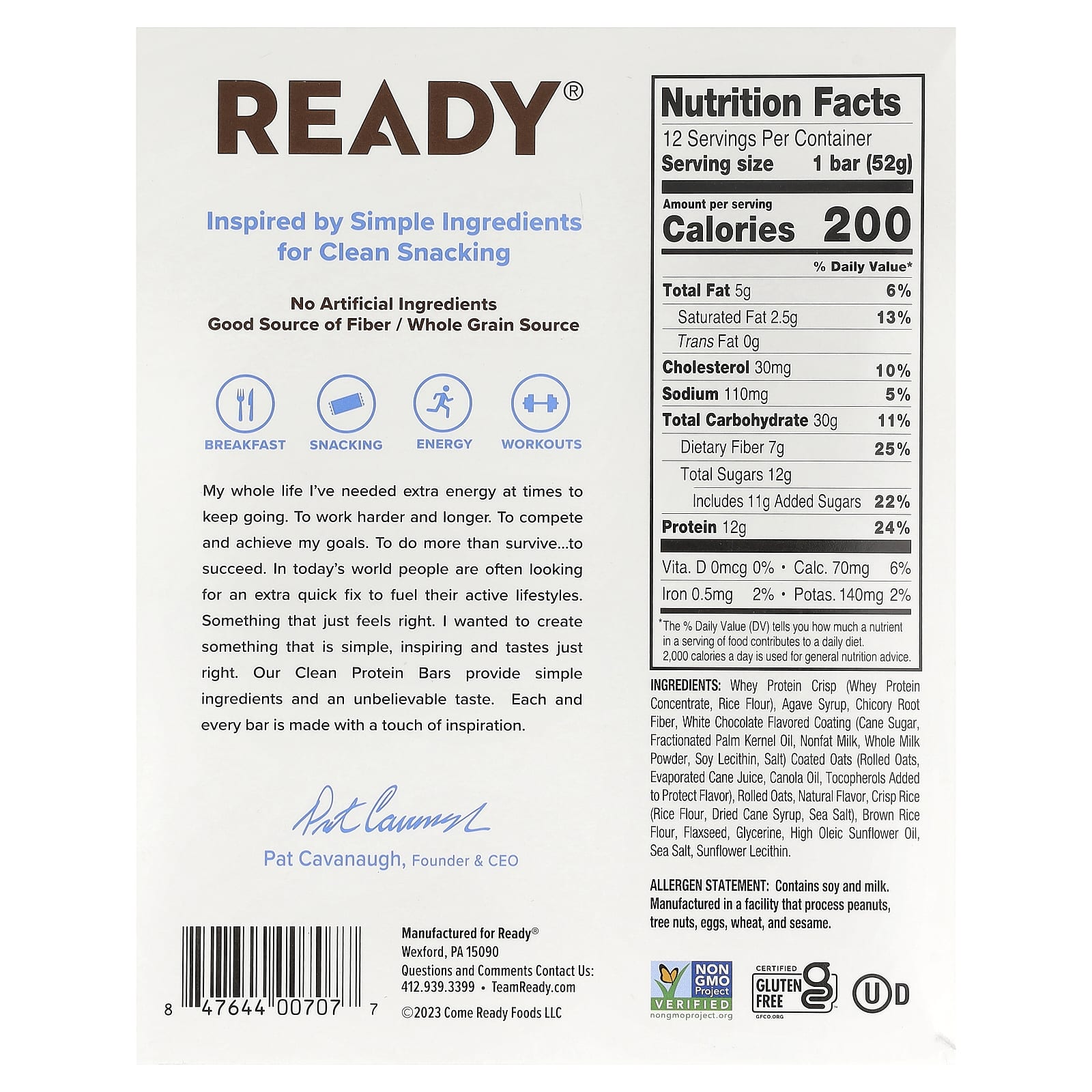 Хрустящий сывороточный протеин (концентрат сывороточного протеина, рисовая мука), сироп агавы, клетчатка из корня цикория, глазурь со вкусом белого шоколада (тростниковый сахар, фракционированное пальмоядровое масло, обезжиренное молоко, сухое цельное молоко, соевый лецитин, соли) овес, покрытый оболочкой (овсяные хлопья, выпаренный сок из тростника, рапсовое масло, токоферолы, добавленные для защиты вкуса), плющеная овсянка, натуральный ароматизатор, рассыпчатый рис (рисовая мука, сушеный тростниковый сироп, морская соль), мука из коричневого риса, льняное семя, глицерин, подсолнечное масло с высоким содержанием олеина, морская соль, подсолнечный лецитин.