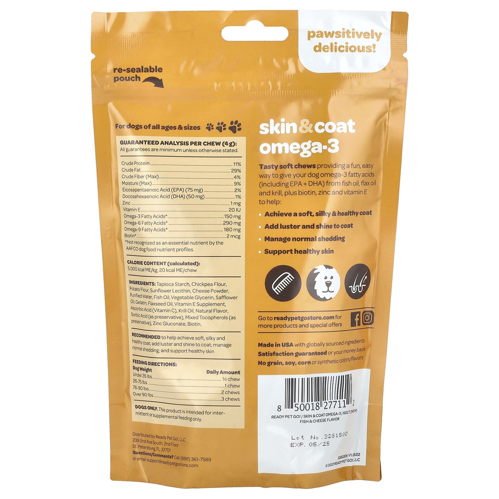 Вкусные мягкие жевательные таблетки позволяют легко и весело добавить в рацион собаки жирные кислоты омега-3 (включая ЭПК и ДГК) из рыбьего жира, льняного масла и криля, а также биотин, цинк и витамин Е, которые обеспечивают перечисленные ниже преимущества.