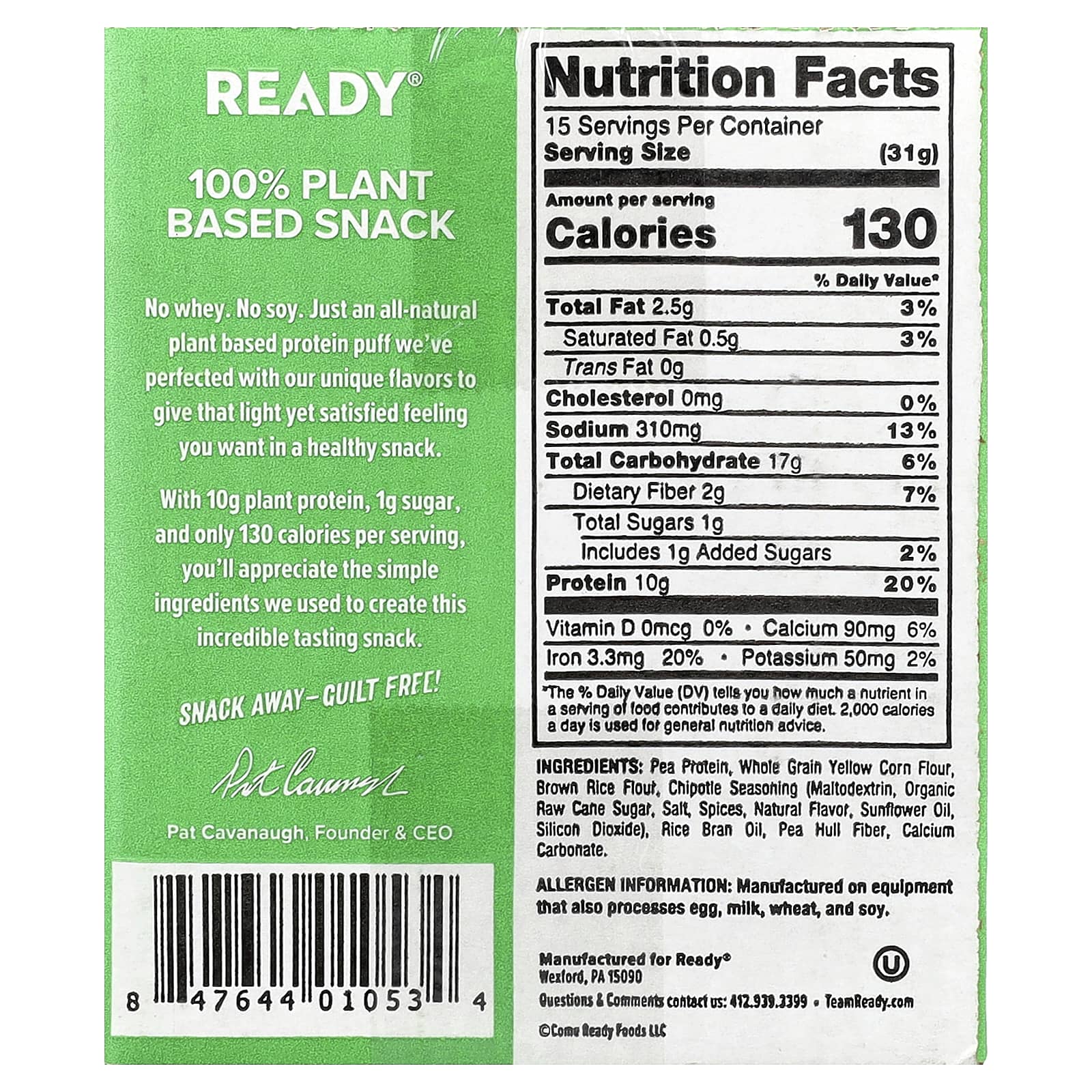 Гороховый протеин, цельнозерновая мука из желтой кукурузы, мука из коричневого риса, приправа чипотле (мальтодекстрин, органический необработанный тростниковый сахар, соль, специи, натуральный ароматизатор, подсолнечное масло, диоксид кремния), масло из рисовых отрубей, гороховая клетчатка, карбонат кальция.