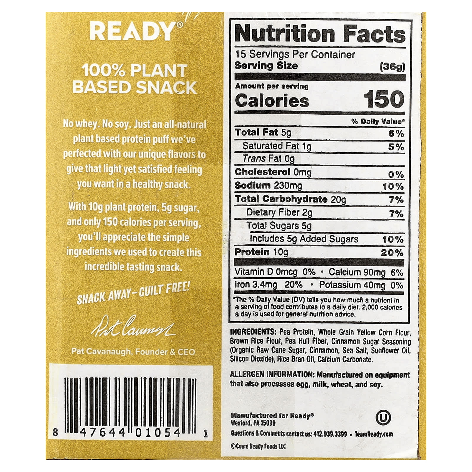 Гороховый протеин, цельнозерновая мука из желтой кукурузы, мука из коричневого риса, гороховая клетчатка, приправы из коричного сахара (органический тростниковый сахар-сырец, корица, морская соль, подсолнечное масло, диоксид кремния), масло из рисовых отрубей, карбонат кальция.