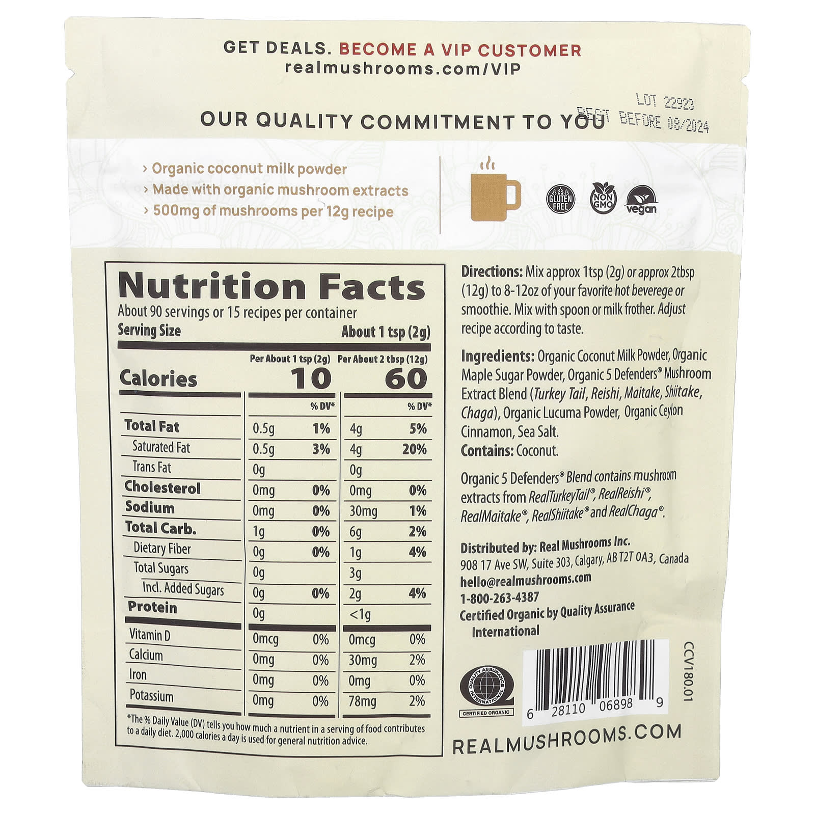 Органическое сухое кокосовое молоко, органическая кленовая сахарная пудра, органическая смесь экстрактов грибов 5 defenders®, рейши, майтаке, шиитаке, чага), органический порошок лукумы, органическая цейлонская корица, морская соль.