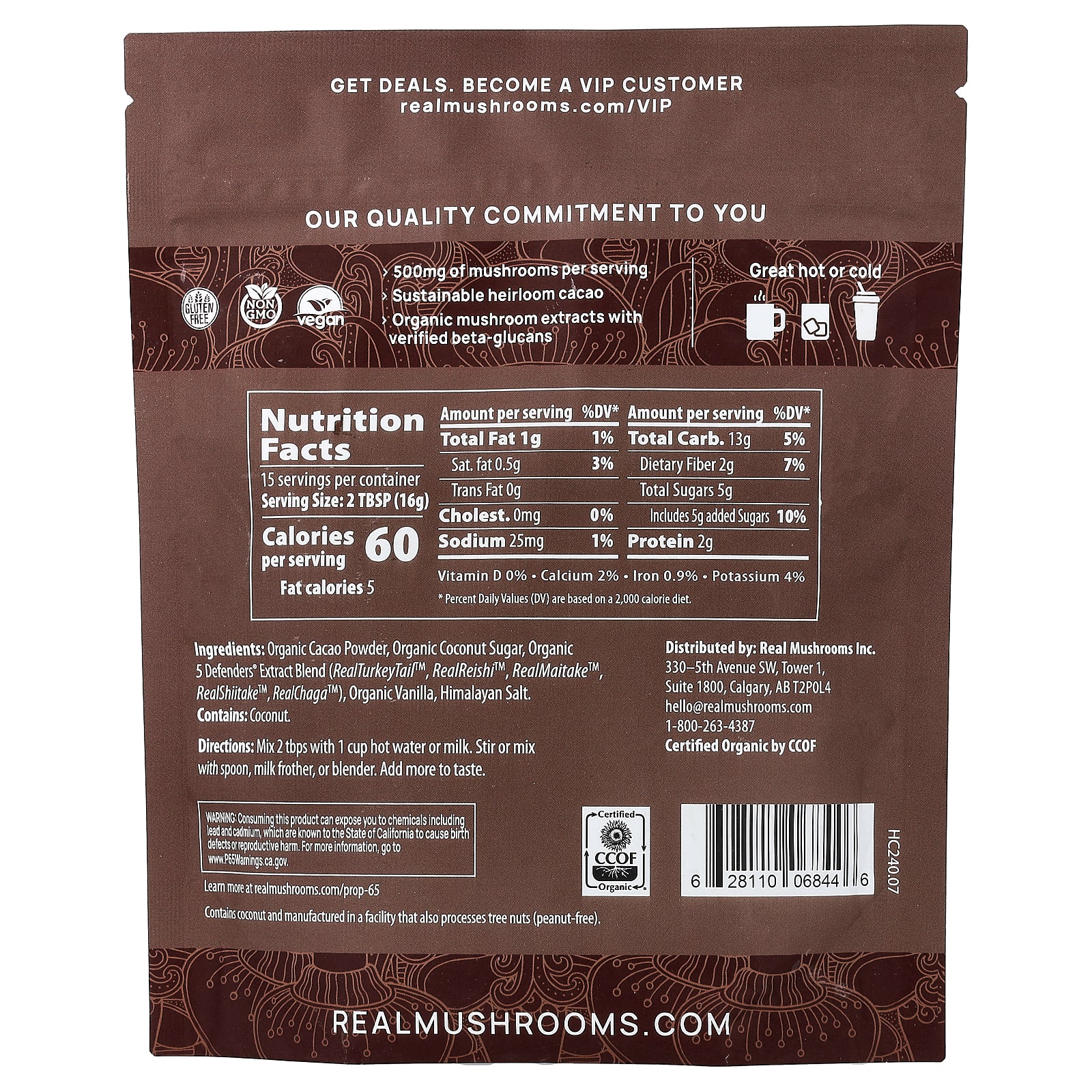 Органический какао-порошок, органический кокосовый сахар, органическая смесь экстрактов 5 Defenders® (realturkeytail™, realreishi™, realmaitake™ realshiitake™, realchaga™), органическая ваниль, гималайская соль