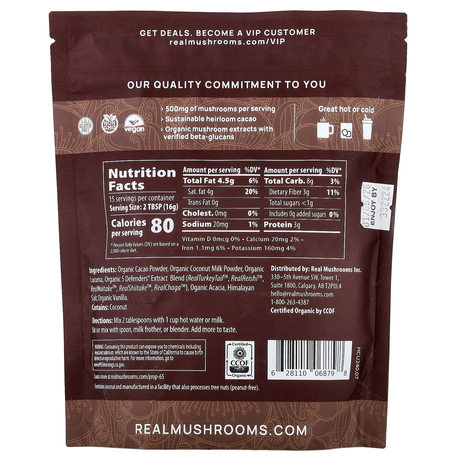 Органический какао-порошок, порошок из органического кокосового молока, органическая лукума, смесь органических экстрактов 5 defenders® (realturkeytail™, realreishi™, realmaitake™, realshiitake™, realchaga™), органическая акация, гималайская соль, органическая ваниль.