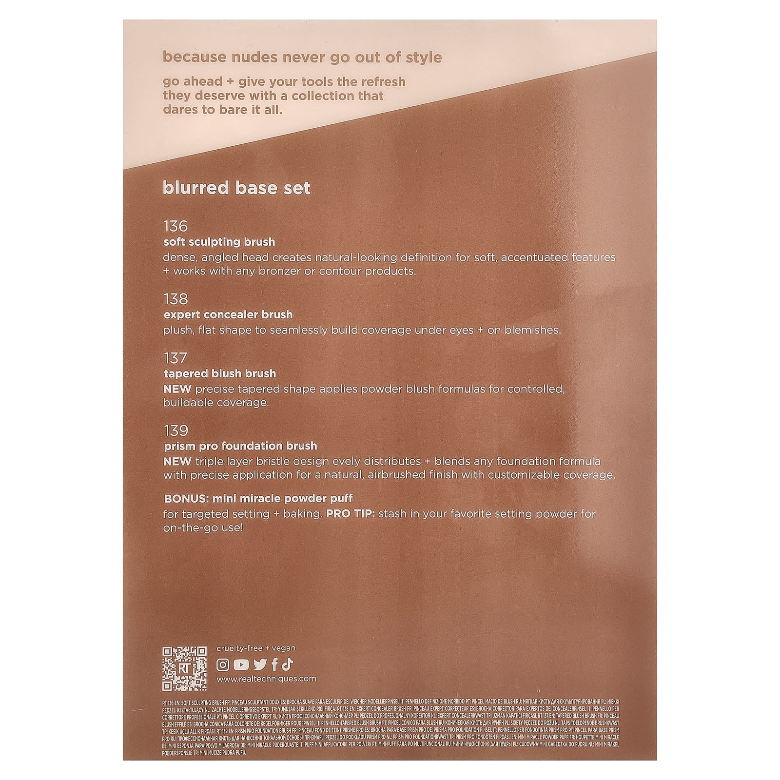 - Кисть для тонального крема Prism Pro, 139 шт. — новый трехслойный ворс, который равномерно распределяет и смешивает любую формулу тонального крема с точным нанесением, обеспечивая естественный эффект ретуши с персонализированным покрытием.