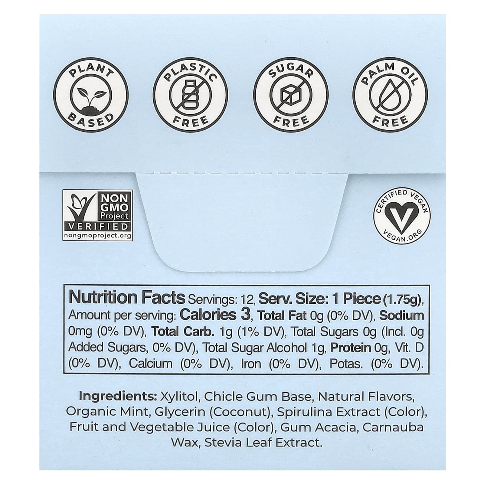 Ксилитол, основа жевательной резинки, натуральные ароматизаторы, органическая мята, глицерин (кокос), экстракт спирулины (краситель), фруктово-овощной сок (краситель), аравийская камедь, карнаубский воск, экстракт листьев стевии.