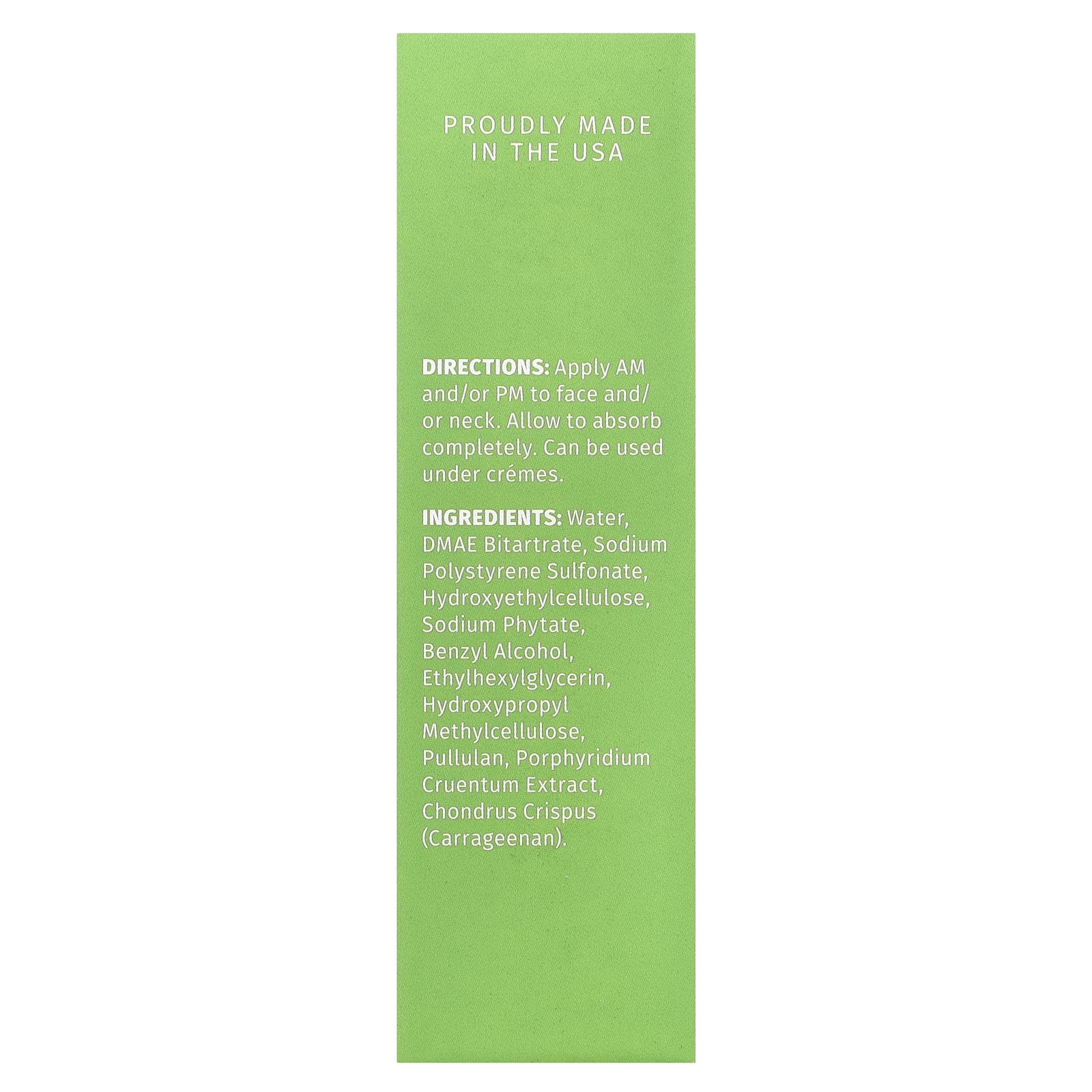 Очищенная вода, битартрат ДМАЭ, денатурированный спирт, натрия полистеренсульфонат, гидроксиэтилцеллюлоза, экстракт водорослей, пуллулан, феноксиэтанол, этилгексилглицерин.