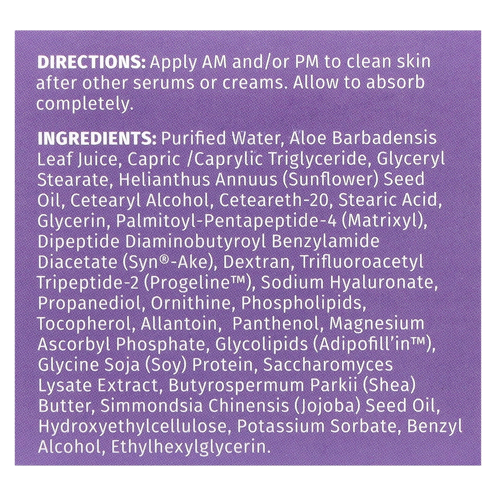 Очищенная вода, сок из листьев алоэ вера (Aloe barbadensis), каприновый / каприловый триглицерид, глицерил стеарат, подсолнечное масло (Helianthus annuus), цетеариловый спирт, цетеарет-20, стеариновая кислота, глицерин, пальмитоил-пентапептид-4 (матриксил), дипептид диаминобутироил бензиламида диацетат (syn®-ake), декстран, трифторацетилтрипептид-2 (прогелин ™), гиалуронат натрия и пропандиол, L-орнитин, фосфолипидов, токоферол, аллантоин, пантенол, аскорбилфосфат магния, гликолипиды (Adipofill 'in ™), соевый белок (глицин), экстракт лизата сахаромицетов, масло ши (Butyrospermum parkii), масло из семян жожоба (Simmondsia chinensis), гидроксиэтилцеллюлоза, сорбат калия, бензиловый спирт, этилгексилглицерин.