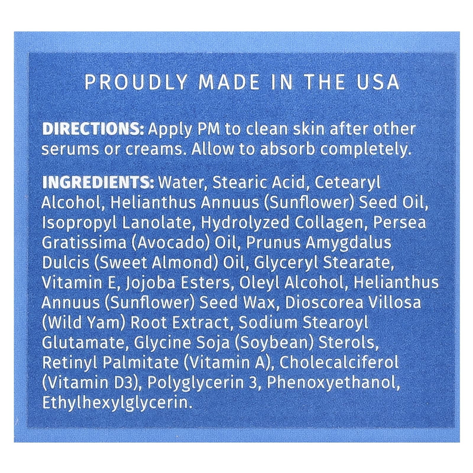 Вода, стеариновая кислота, цетеариловый спирт, подсолнечное масло (Helianthus annuus), изопропил ланолат, спирт жожоба, жожобат калия, гидролизованный коллаген, масло авокадо (Persea gratissima), масло сладкого миндаля (Prunus amygdalus dulcis), витамин E, каприлилгликоль, экстракт стеролов (олеиловый спирт, экстракт корня дикого ямса, стеролы глицина сои (Glycine soja)), пропандиол, ретинилпальмитат (витамин A), холекальциферол (витамин D3), феноксиэтанол, этилгексилглицерин.