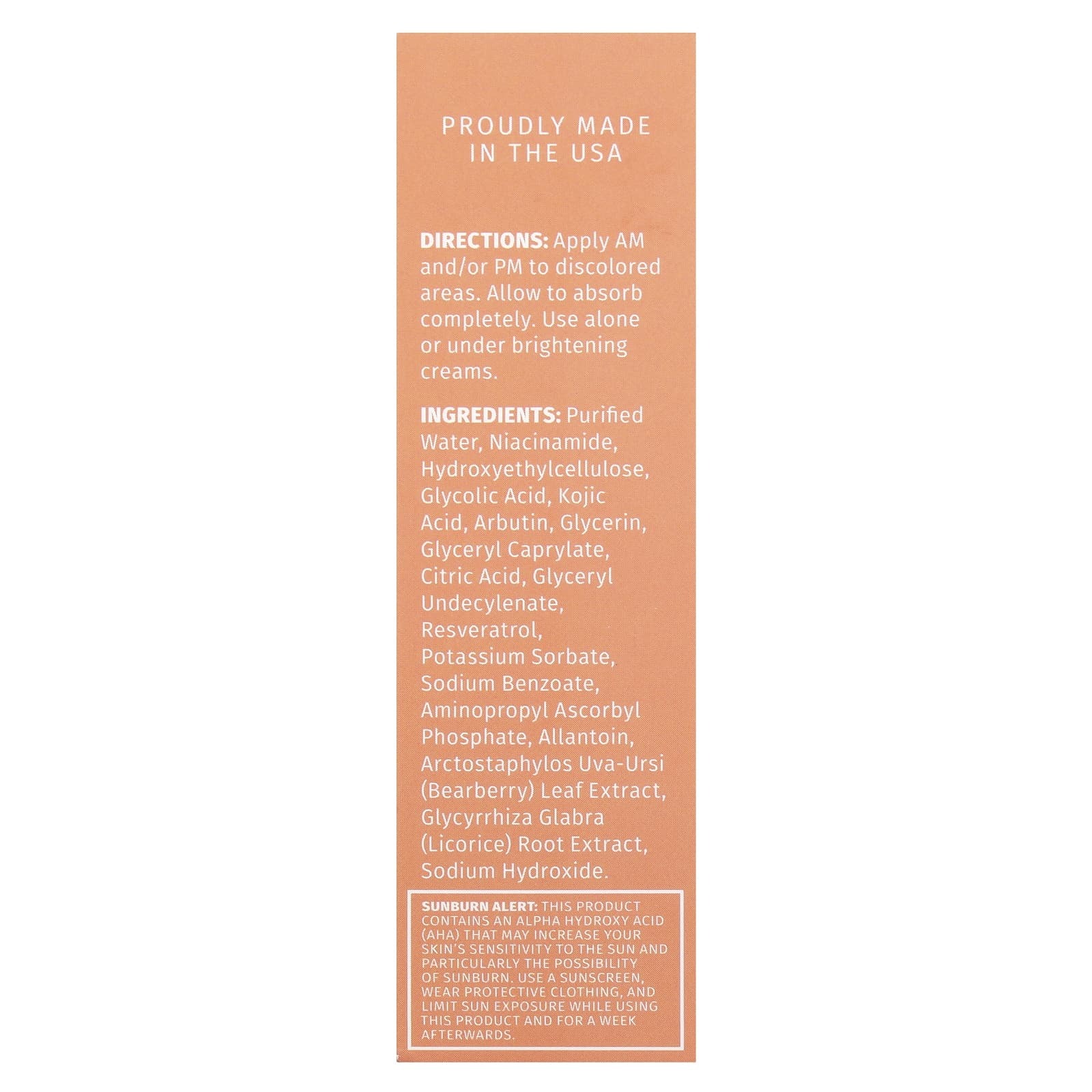 Эта уникальная формула содержит осветляющие ингредиенты: гликолевую и койевую кислоты, никотинамид, ресвератрол, витамин С, арбутин, солодку и толокнянку.