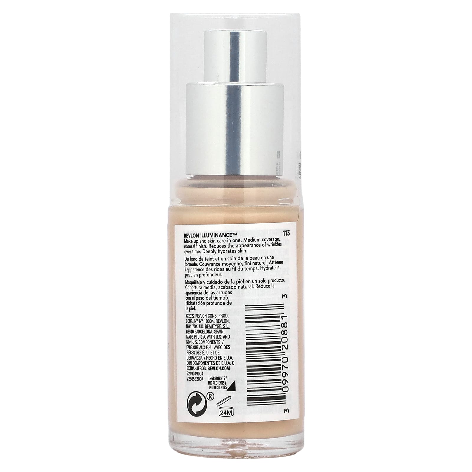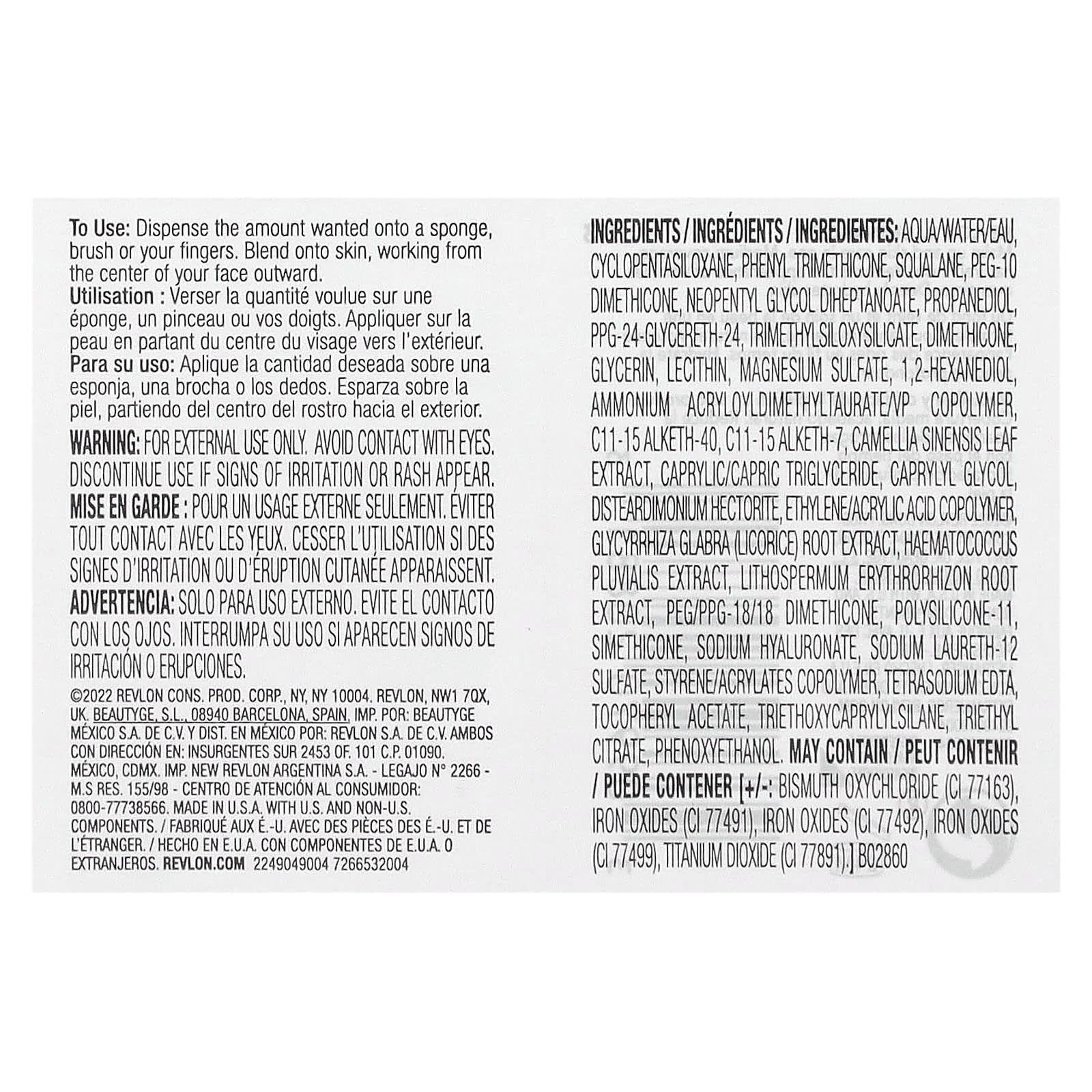 Вода, циклопентасилоксан, фенилтриметикон, сквалан, ПЭГ-10 диметикон, неопентилгликоль дигептаноат, пропандиол, ППГ-24-глицерет-24, триметилсилоксисиликат, диметикон, глицерин, лецитин, сульфат магния, 1,2-гександиол, аммоний акрилоилдиметилтаурат/ВП сополимер, c11-15 alketh-40, c11-15 alketh-7, экстракт листьев зеленого чая (Camellia sinensis), каприловый/каприновый триглицерид, каприлилгликоль, дистеардимония гекторит, сополимер этилена и акриловой кислоты, экстракт корня солодки (Glycyrrhiza glabra), экстракт гематококка дождевого (Haematococcus pluvialis), экстракт корня воробейника (Lithospermum erythrorhizon), ПЭГ/ППГ-18/18 диметикон, полисиликон-11, симетикон, гиалуронат натрия, натрия лаурет-12 сульфат, сополимер стирол/акрилаты, тетранатрия ЭДТК, токоферилацетат, триэтоксикаприлилсилан, триэтилцитрат, феноксиэтанол. Может содержать [+ / -: оксихлорид висмута (CI 77163), оксиды железа (CI 77491), оксиды железа (CI 77492), оксиды железа (CI 77499), диоксид титана (CI 77891).