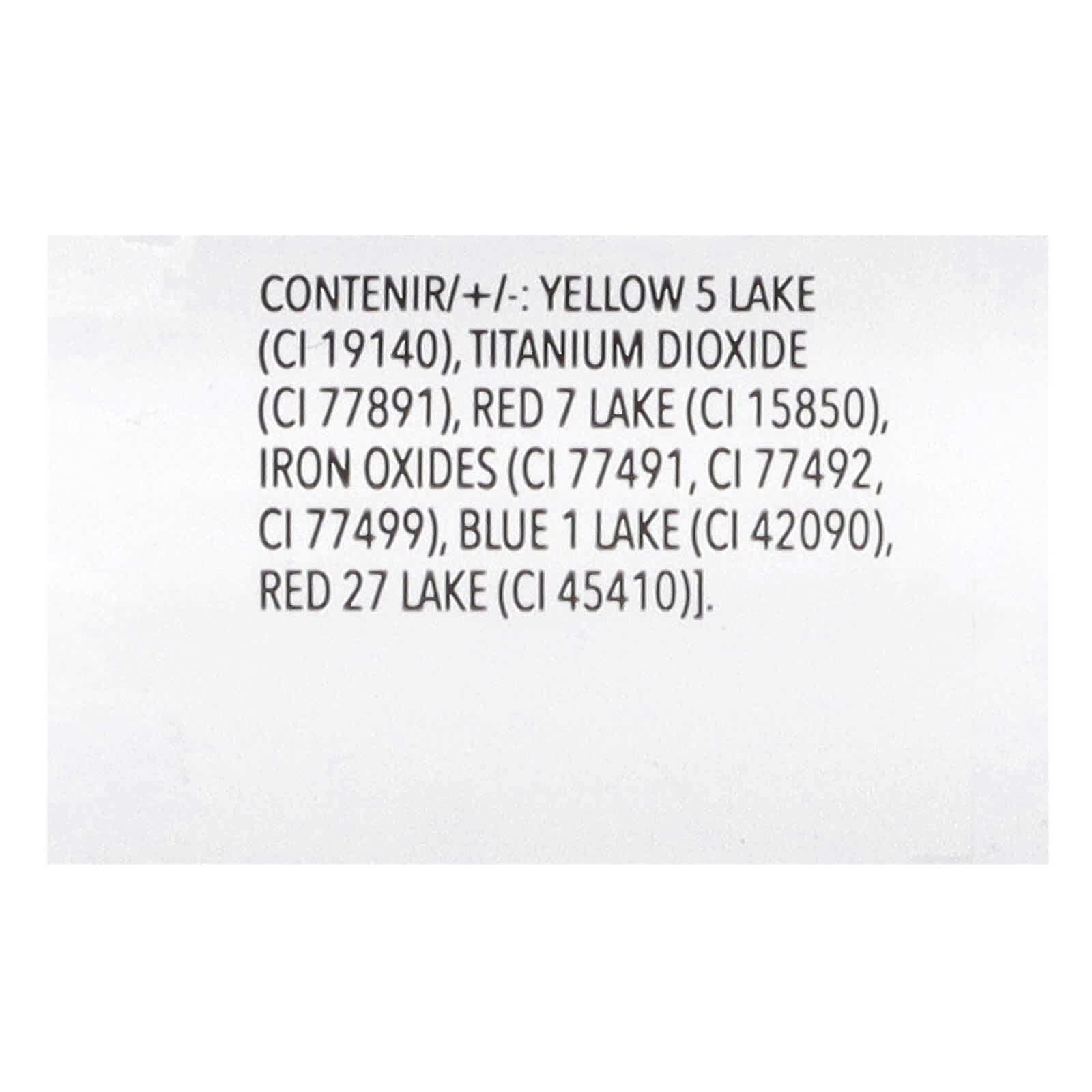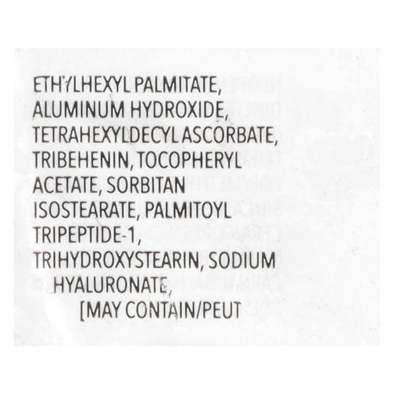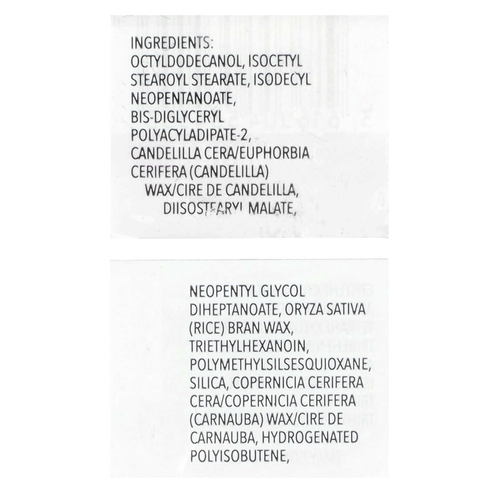 Октилдодеканол, изоцетил стеароил стеарат, изодецилнеопентаноат, бис-диглицерил полиациладипат-2, канделильский воск (Candelilla cera/Euphorbia cerifera), диизостеарил малат, неопентилгликоль дигептаноат, воск из рисовых отрубей (Oryza sativa), триэтилгексаноин, полиметилсилсесквиоксан, диоксид кремния, карнаубский воск (Copernicia cerifera), гидрогенизированный полиизобутен, этилгексил пальмитат, гидроксид алюминия, тетрагексилдецил аскорбат, трибехенин, токоферилацетат, сорбитан изостеарат, пальмитоил трипептид-1, тригидроксистеарин, гиалуронат натрия, [может содержать краситель желтый 5 лак (CI 19140), диоксид титана (CI 77891), краситель красный 7 лак (CI 15850), оксиды железа (CI 77491, CI 77492, CI 77499), краситель синий 1 лак (CI 42090), краситель красный 27 лак (CI 45410)].