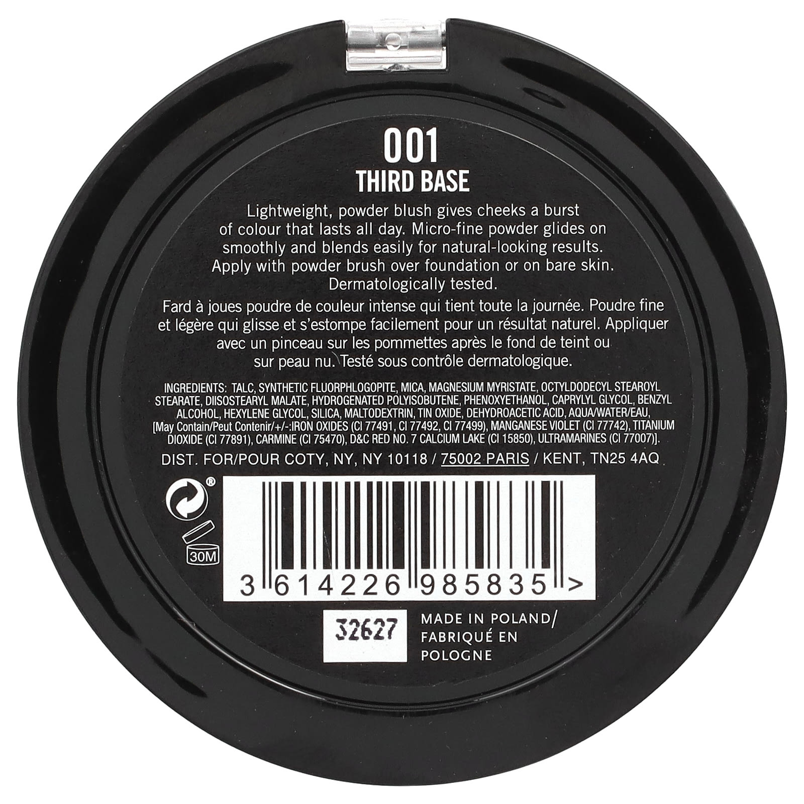 Тальк, синтетический фторфлогопит, слюда, миристат магния, октилдодецил стеароил стеарат, диизостеарил малат, гидрогенизированный полиизобутен, феноксиэтанол, каприлилгликоль, бензиловый спирт, гексиленгликоль, диоксид кремния, мальтодекстрин, оксид олова, дегидроуксусная кислота, вода/eau. [Может содержать/+/-: оксиды железа (CI 77491, CI 77492, CI 77499), краситель темно-фиолетовый (CI 77742), диоксид титана (CI 77891), кармин (CI 75470), краситель красный 7 D&C кальциевый лак (CI 15850), ультрамарины (CI 77007)].