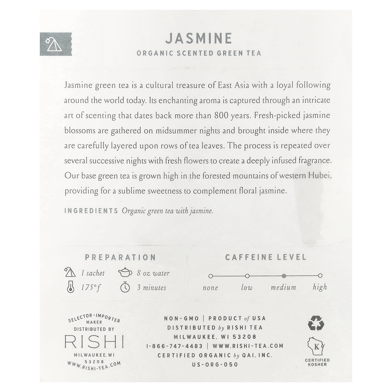Зеленый чай с жасмином - это культурное сокровище Восточной Азии, которое сегодня имеет верные поклонники по всему миру. Его чарующий аромат передается через сложное искусство создания ароматов, которое насчитывает более 800 лет. Свежесобранные цветы жасмина собирают в летние ночи и приносят внутрь, где аккуратно кладут на ряды чайных листьев. Этот процесс повторяется несколько вечеров подряд со свежими цветами, чтобы создать насыщенный аромат. Наш базовый зеленый чай выращивают высоко в лесных горах на западе Хубэй, он придает изысканную сладость цветочному жасмину.
