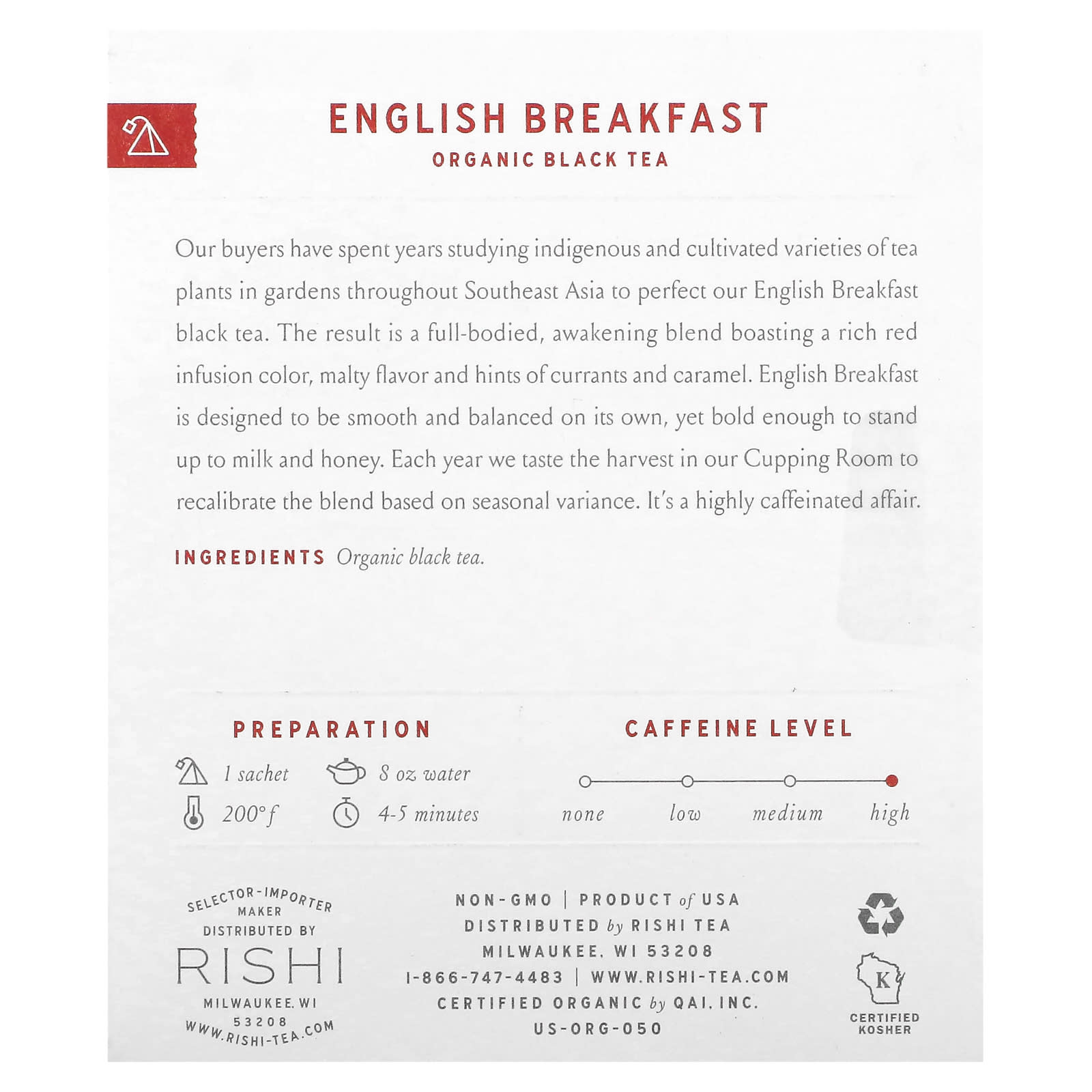 Rishi Tea, Органический черный чай, английский завтрак, 15 пакетиков, 48 г (1,69 унции)