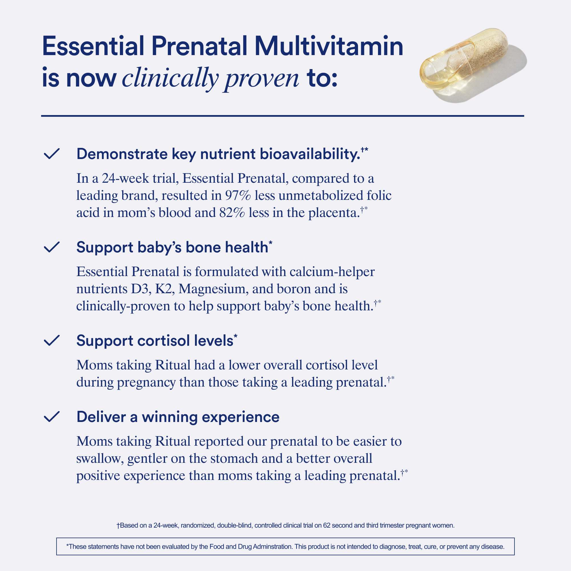 В клиническом исследовании у мам, принимавших Essential Prenatal, был более низкий общий уровень кортизола во время беременности, чем у мам, принимавших этот пренатальный комплекс.