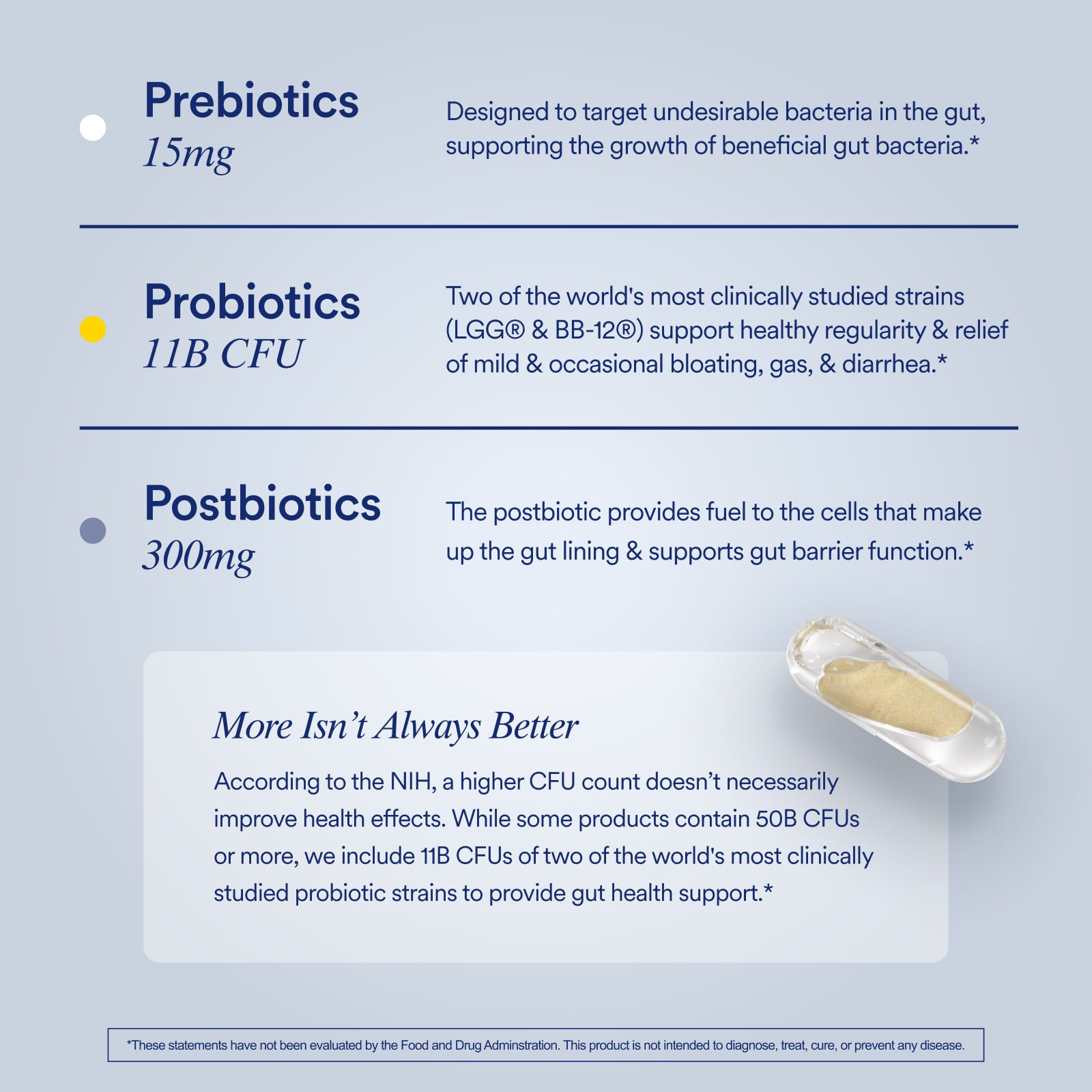 Клинически изученные пребиотики, пробиотики и постбиотик 3 в 1 для поддержания сбалансированного микробиома кишечника.