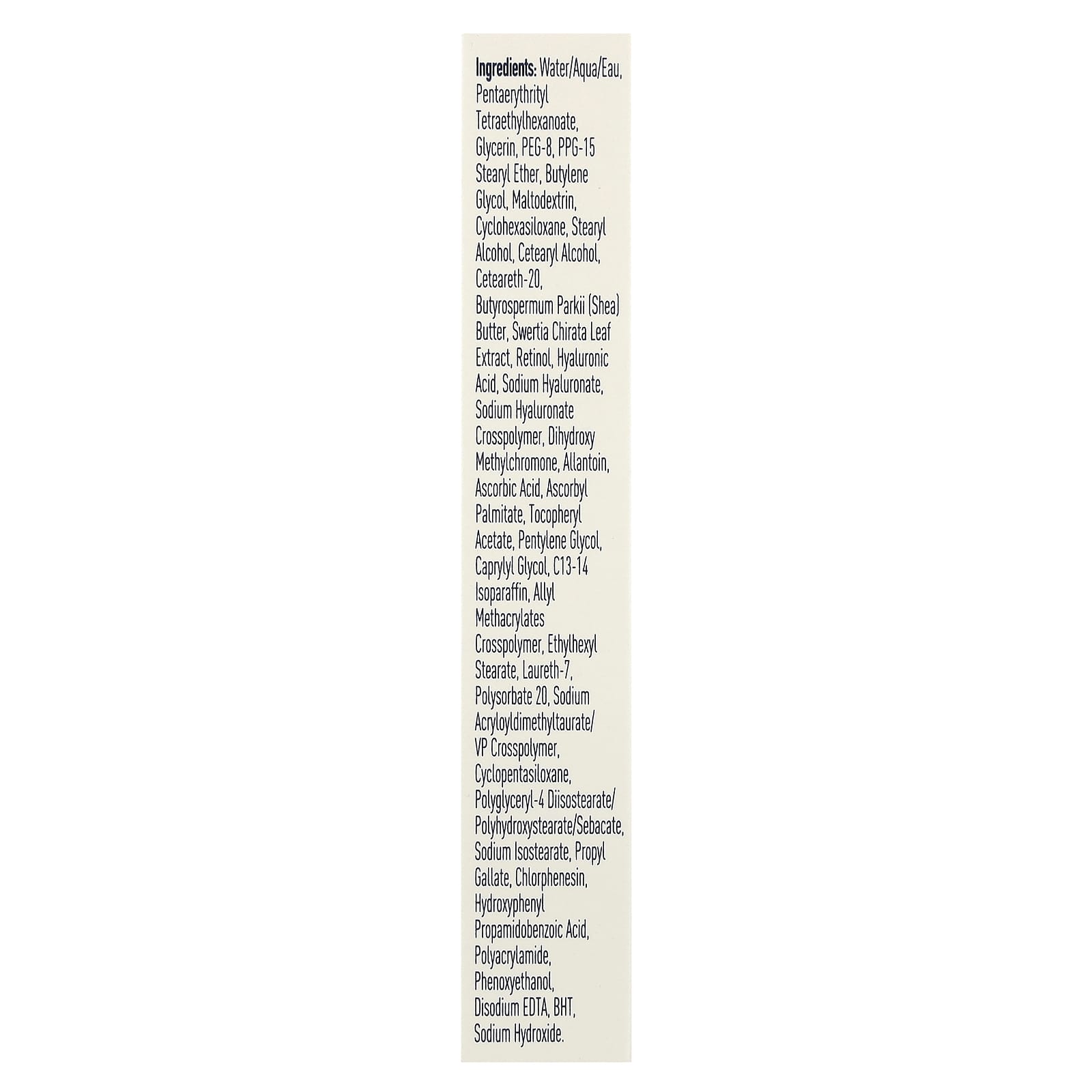 Вода (eau), пентаэритритил тетраэтилгексаноат, глицерин, ПЭГ-8, ППГ-15 стеариловый эфир, бутиленгликоль, мальтодекстрин, циклогексасилоксан, стеариловый спирт, цетеариловый спирт, цетеарет-20, масло ши (Butyrospermum parkii), экстракт листьев сверции хирата, ретинол, гиалуроновая кислота, гиалуронат натрия, кроссполимер гиалуроната натрия, дигидроксиметилхромон, аллантоин, аскорбиновая кислота, аскорбил пальмитат, токоферилацетат, пентилен гликоль, каприлилгликоль, c13-14 изопарафин, кроссполимер аллилметакрилата, этилгексил стеарат, лаурет-7, полисорбат 20, акрилоилдиметилтаурат натрия / ВП кроссполимер, циклопентасилоксан, полиглицерил-4 диизостеарат/полигидроксистеарат/себакат, изостеарат натрия, пропилгаллат, хлорфенезин, гидроксифенилпропамидобензойная кислота, полиакриламид, феноксиэтанол, двунатриевая ЭДТК, бутилгидрокситолуол, гидроксид натрия.