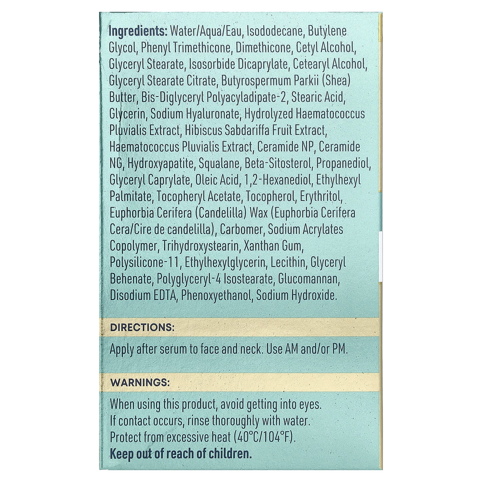 Вода (eau), изододекан, бутиленгликоль, фенилтриметикон, диметикон, цетиловый спирт, глицерил стеарат, изосорбид дикаприлат, Цетеариловый спирт, глицерил стеарат цитрат, Масло Butyrospermum parkii (Ши), бис-диглицерил полиациладипат-2, стеариновая кислота, глицерин, гиалуронат натрия, гидролизованный экстракт гематококка (Haematococcus pluvialis), экстракт плодов розеллы (Hibiscus sabdariffa), экстракт гематококка дождевого (Haematococcus pluvialis), Керамид NP, керамид нг, гидроксиапатит, сквалан, бета-ситостерин, пропандиол, глицерил каприлат, олеиновая кислота, 1,2-гександиол, этилгексил пальмитат, токоферилацетат, Токоферол, эритритол, канделильский воск (Euphorbia cerifera cera/cire de candelilla), Карбомер, сополимер акрилатов натрия, тригидроксистеарин, Ксантановая камедь, полисиликон-11, этилгексилглицерин, лецитин, глицерил бегенат, полиглицерил-4 изостеарат, глюкоманнан, Динатрия ЭДТА, феноксиэтанол, гидроксид натрия.