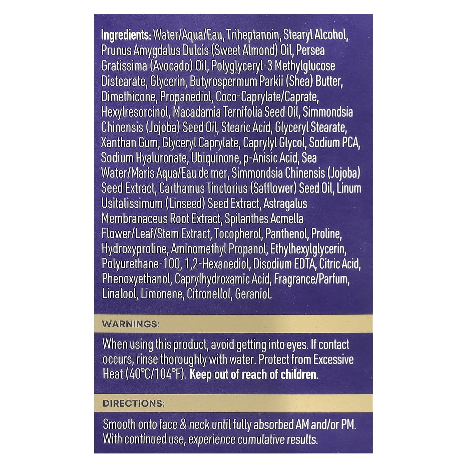 Вода (eau), тригептаноин, стеариловый спирт, масло сладкого миндаля (Prunus amygdalus dulcis), масло авокадо (Persea gratissima), полиглицерил-3 метилглюкозы дистеарат, глицерин, масло ши (Butyrospermum parkii), диметикон, пропандиол, коко-каприлат/капрат, гексилрезорцин, масло макадамии (Macadamia ternifolia), масло из семян жожоба (Simmondsia chinensis), стеариновая кислота, глицерил стеарат, ксантановая камедь, глицерил каприлат, каприлилгликоль, натрия p гиалуронат натрия, убихинон, п-анисовая кислота, морская вода / Maris Aqua / вода, экстракт семян жожоба (Simmondsia chinensis), масло семян сафлора (Carthamus tinctorius), экстракт семян льна (Lin usitatissimum), экстракт корня астрагала перепончатого, экстракт цветков/листьев/стебля акмеллы (Spilanthes acmella), токоферол, пантенол, пролин, гидроксипролин, аминометил пропанол, этилгексилглицерин, полиуретан-100,1,2-гександиол, двунатриевая ЭДТК, лимонная кислота, феноксиэтанол, каприлгидроксаминовая кислота, отдушка / парфюмерная линалоол, лимонена, цитронеллола, гераниол.