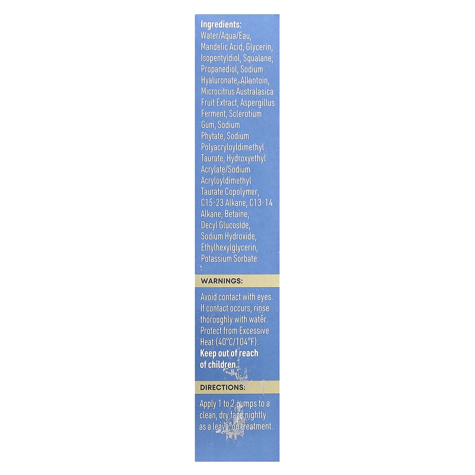 Water/aqua/eau, mandelic acid, glycerin, isopentyldiol, squalane, propanediol, sodium hyaluronate, allantoin, microcitrus australasica fruit extract, aspergillus ferment, sclerotium gum, sodium phytate, sodium polyacryloyldimethyl taurate, hydroxyethyl acrylate/sodium acryloyldimethyl taurate copolymer, c15-23 alkane, c13-14 alkane, betaine, decyl glucoside, sodium hydroxide, ethylhexylglycerin, potassium sorbate.